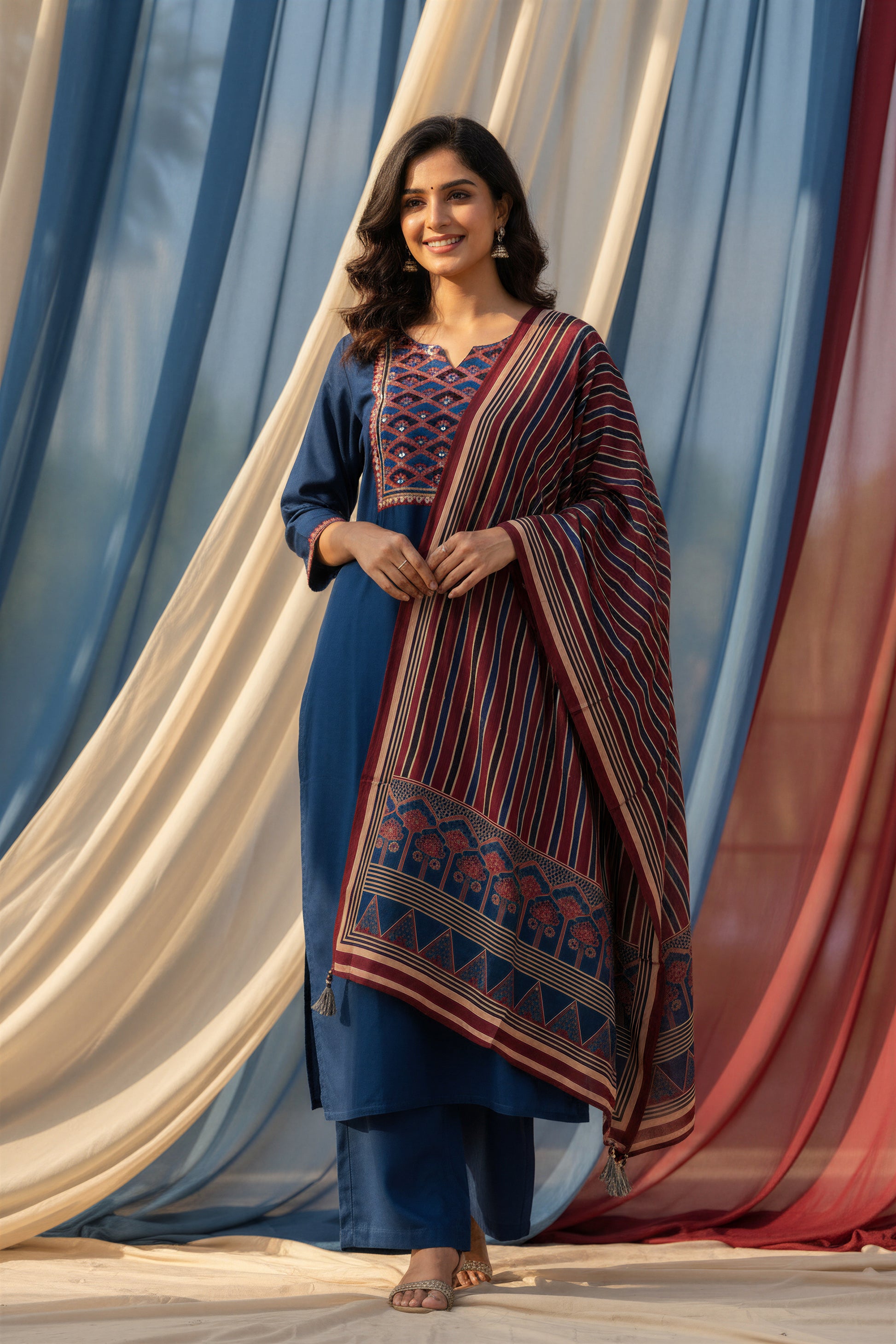 "Anokhi Chamak" radiates vibrancy with its deep navy blue rayon fabric, designed to captivate. This three-piece set features a striking contrasting embroidered patch on the yoke, bringing a bold element to the ensemble. The shawl mirrors the yoke color, creating a cohesive and eye-catching look. Additionally, the contrasting patches adorn the pockets and sleeve borders, adding playful detail to this stylish piece. Perfect for those who want to make a statement while embracing elegance.