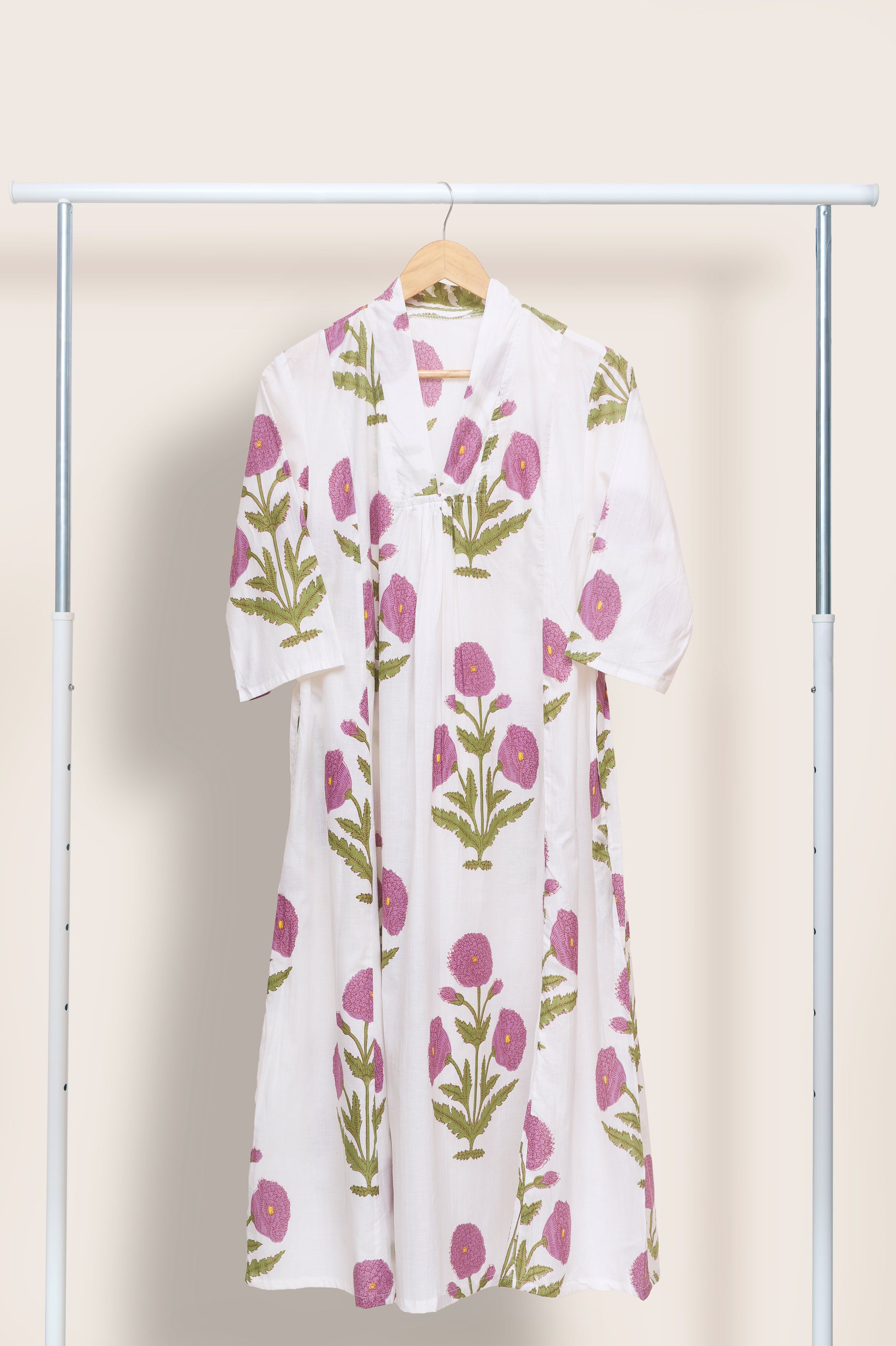 Fiza is the epitome of effortless summer elegance, a breezy, mid-length dress in pristine white, designed for comfort and grace. True to its name, meaning 'breeze,' its flowy silhouette moves with ease, enhanced by a plunging V-neckline and functional side pockets. The timeless poppy motif, perhaps the most iconic of all Mughal butahs, is rooted in tradition yet remains effortlessly modern in its appeal. Adorned with this exquisite floral design in a medley of colors, Fiza beautifully blends heritage with contemporary charm, making it a perfect choice for sun-drenched days.