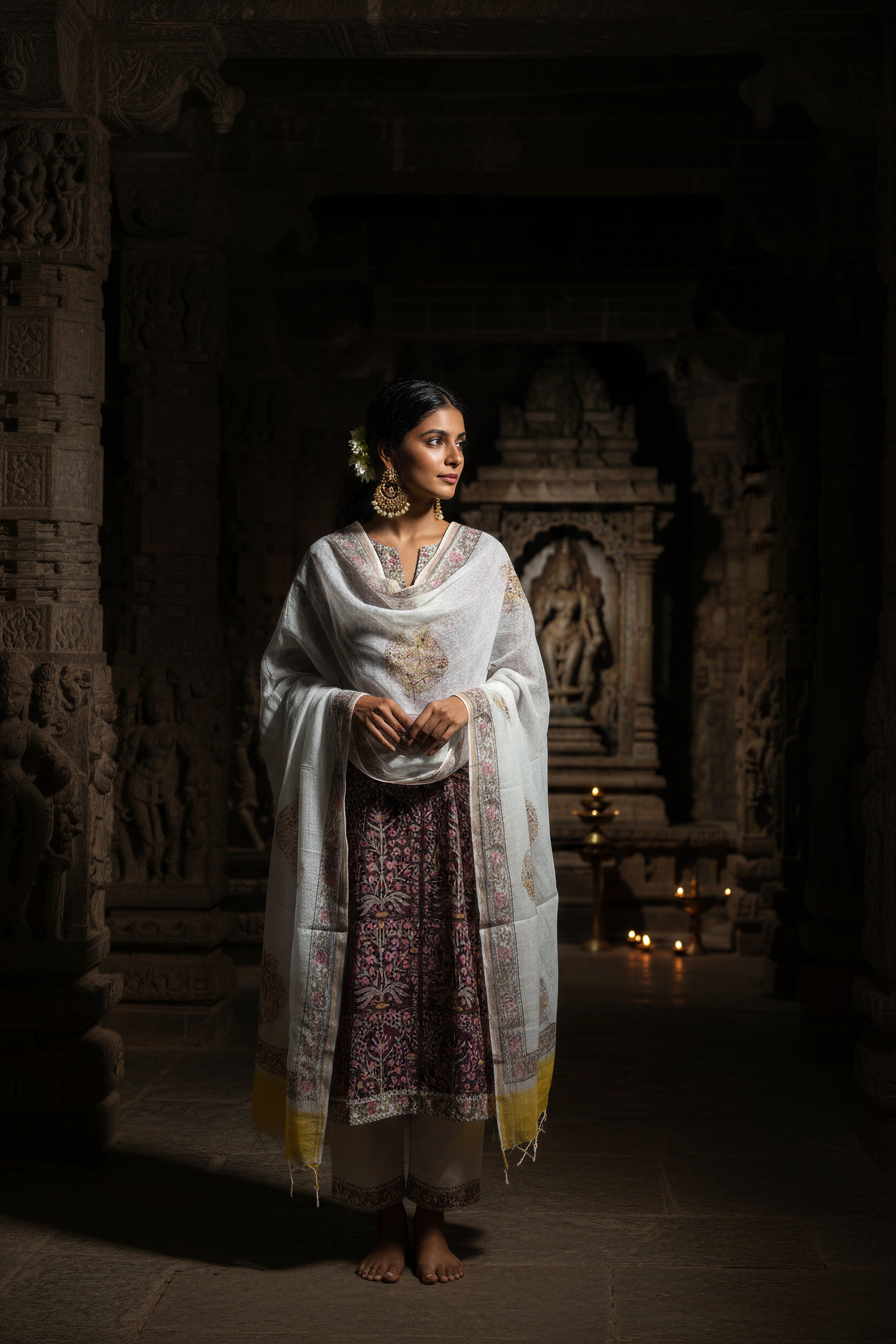 "Kota Kainaat Falak" is a striking maroon handblock printed salwar set that beautifully combines tradition and elegance. The light hand embroidery on the placket adds a sophisticated touch, enhancing its refined charm. Paired with a contrasting Kota doria dupatta and bottom, this ensemble creates a stunning visual appeal that captures attention. Perfect for festive occasions or intimate gatherings, "Kota Falak" embodies the essence of timeless beauty and grace.