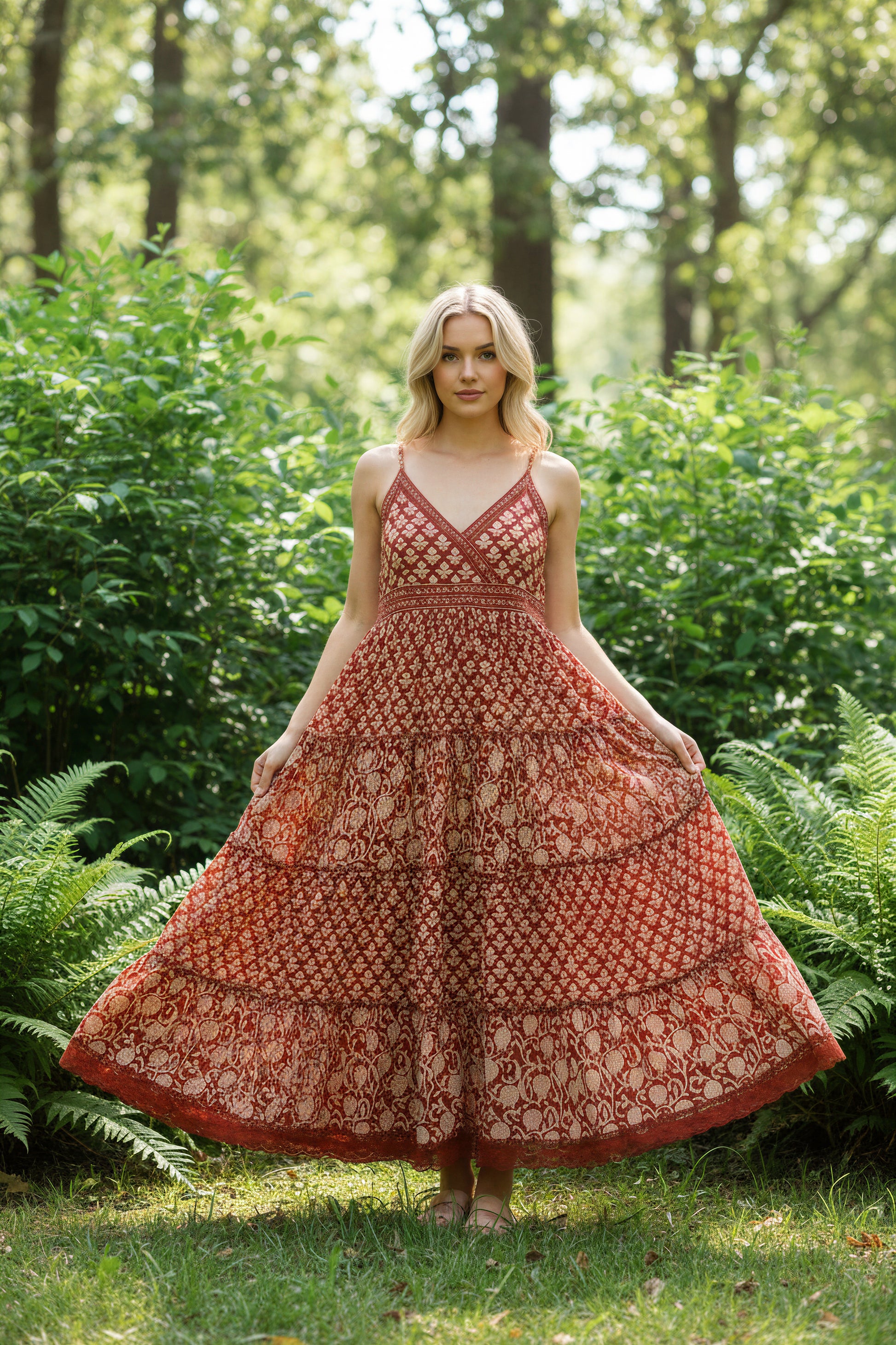 "A timeless verse reimagined in red- Leher Ayat is a celebration of ease and elegance. This strappy, empire-line dress features warm red tones paired with beige handblock printed panels that cascade into a flared silhouette. Crafted in soft cotton and finished with delicate lace at the hem, it brings together comfort and grace in every detail. Ankle-length and breezy, it's the perfect choice for sunlit days and slow summer moments."