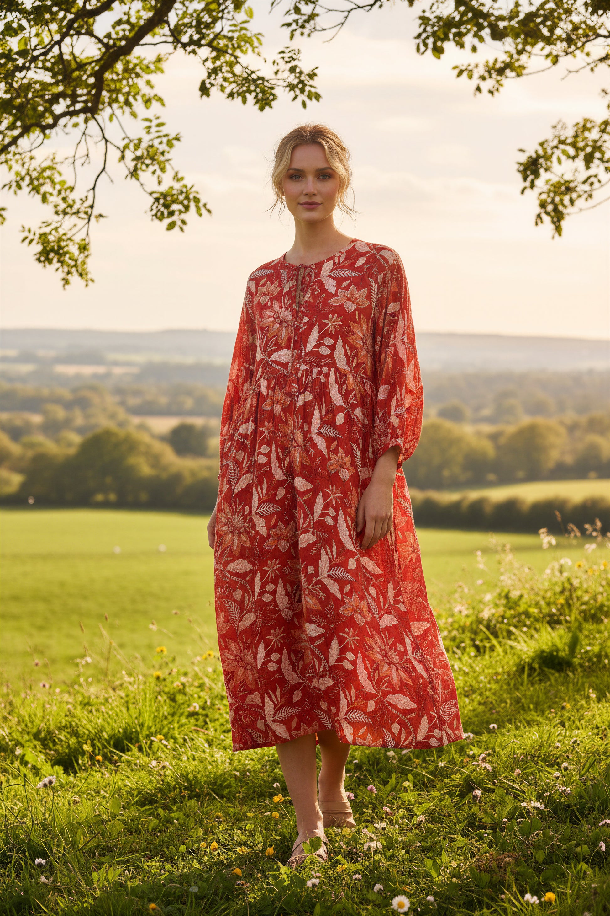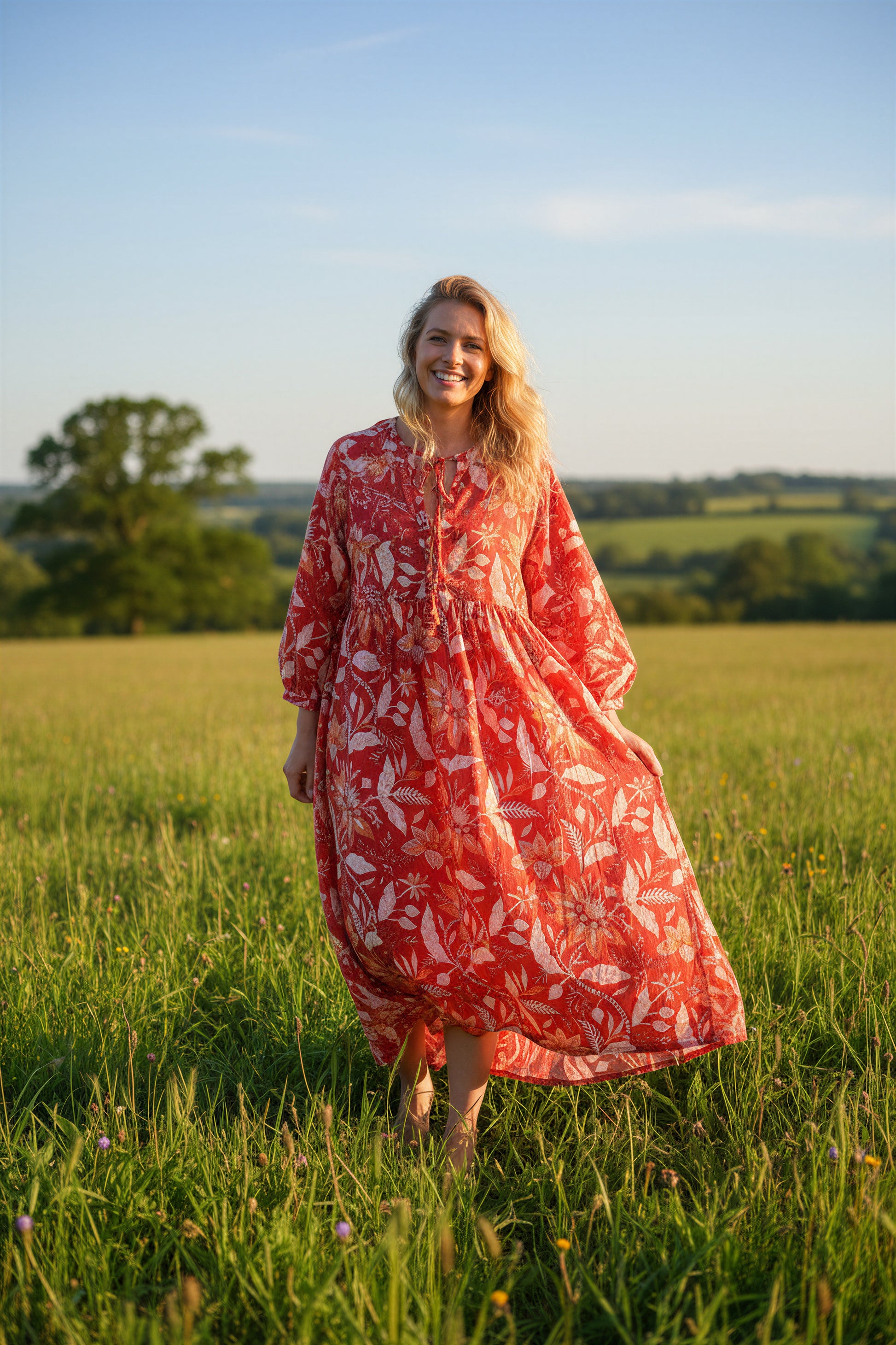 This super free-size dress is all about ease and elegance, featuring breezy balloon sleeves and a stunning maroon floral handblock print. Designed to let you move freely and feel beautiful, it’s that perfect throw-on-and-glow piece for summer days.