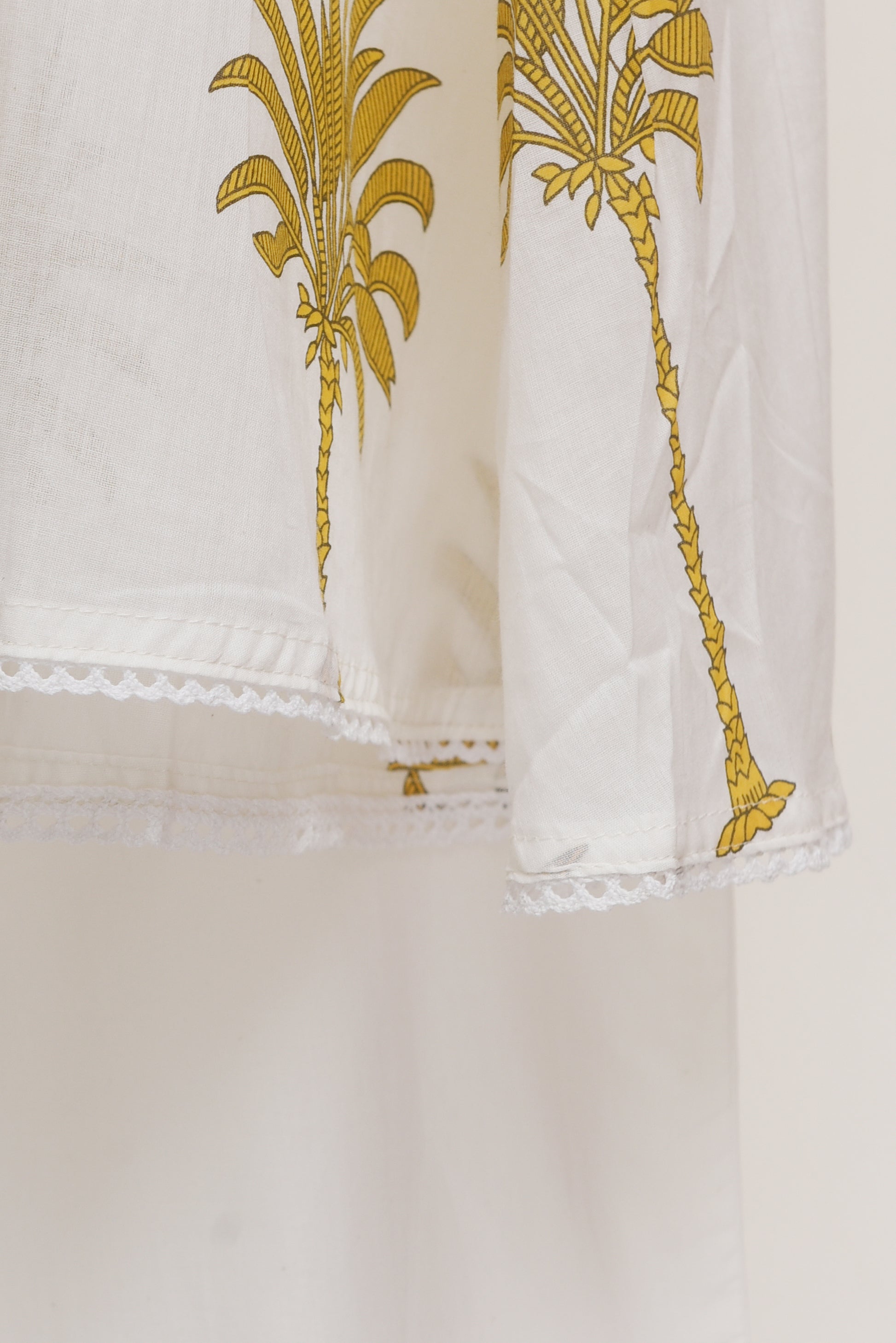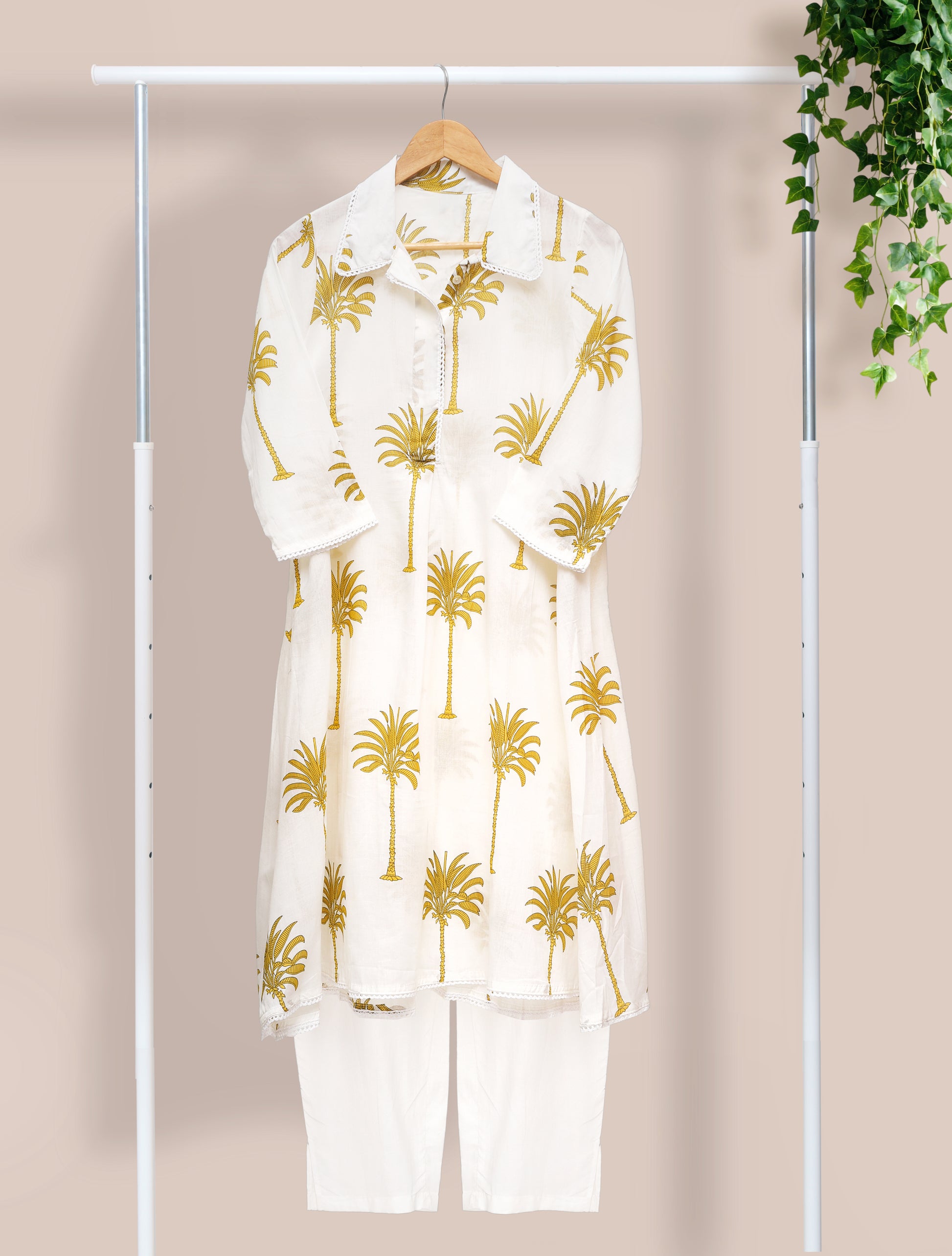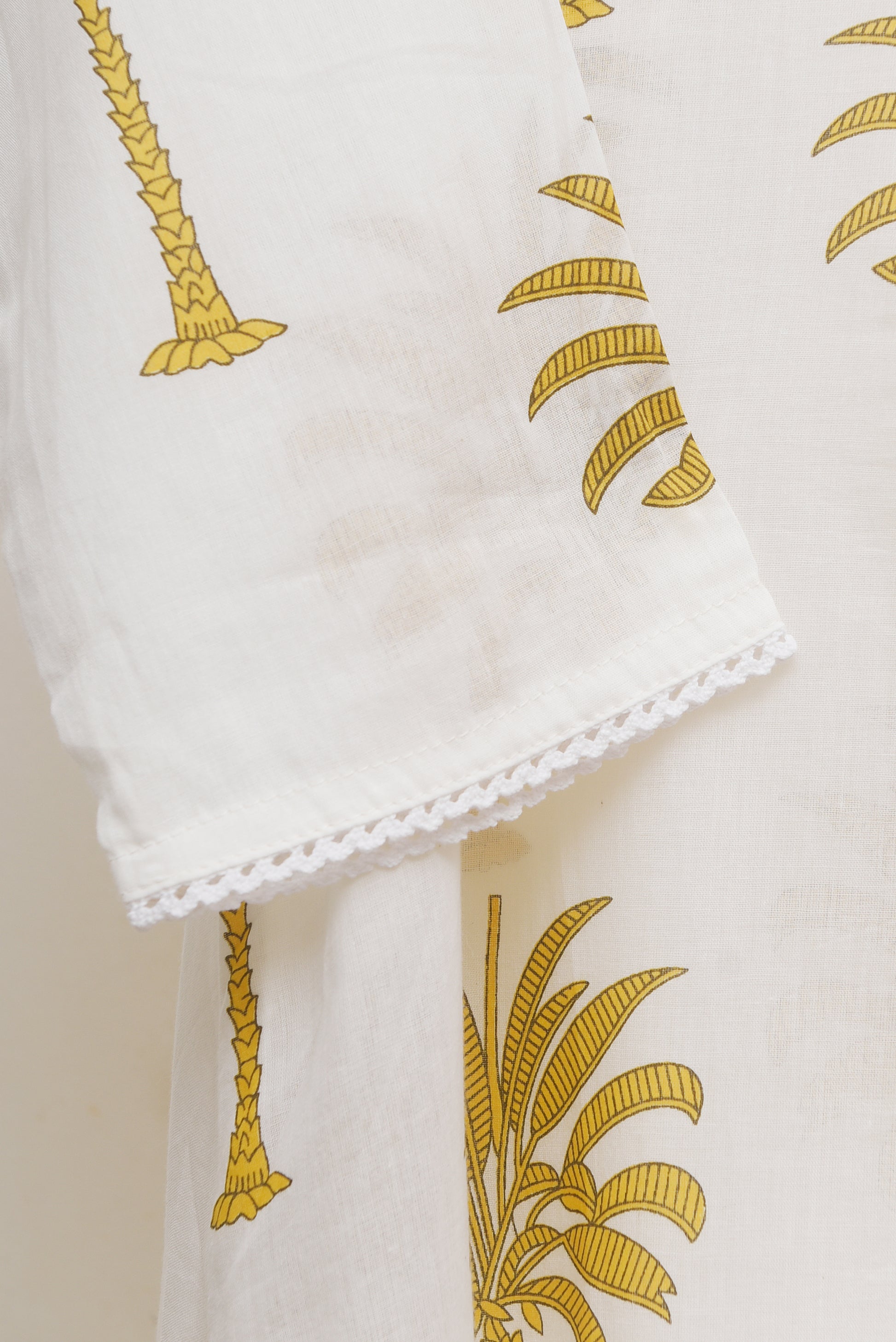 Meher Aabroo is a relaxed yet luxurious co-ord set in soft mul cotton, blending comfort with effortless style. The top features a casual collar and an easy, loose-fitting silhouette, adorned with lace detailing along the collar, sleeves, and hem for a touch of refinement. Its tropical-inspired print adds a breezy charm, perfectly balanced by the plain bottoms that lend sophistication to the overall look. For those who seek luxury, comfort, and style in equal measure, Meher Aabroo is the perfect pick.