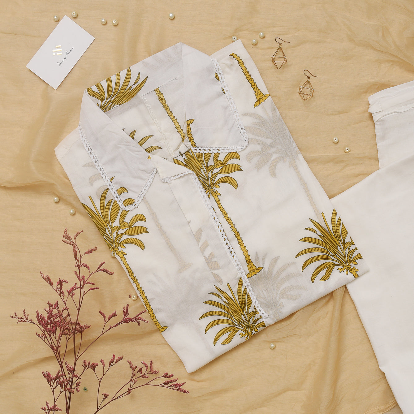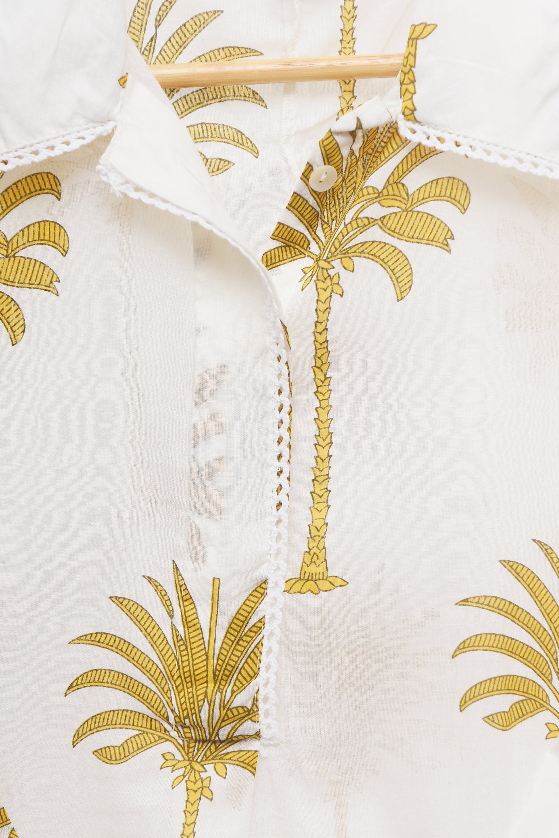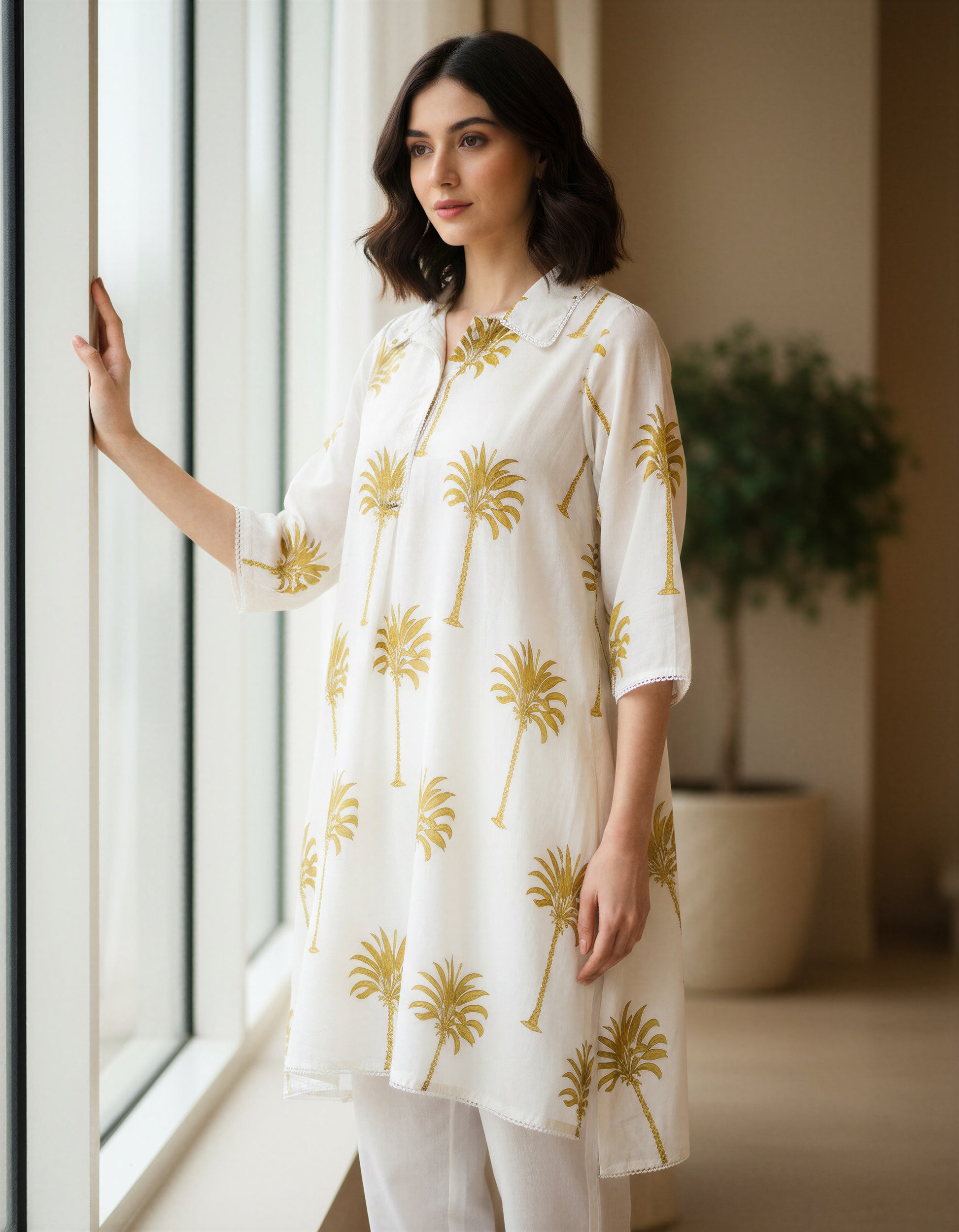 Meher Aabroo is a relaxed yet luxurious co-ord set in soft mul cotton, blending comfort with effortless style. The top features a casual collar and an easy, loose-fitting silhouette, adorned with lace detailing along the collar, sleeves, and hem for a touch of refinement. Its tropical-inspired print adds a breezy charm, perfectly balanced by the plain bottoms that lend sophistication to the overall look. For those who seek luxury, comfort, and style in equal measure, Meher Aabroo is the perfect pick.