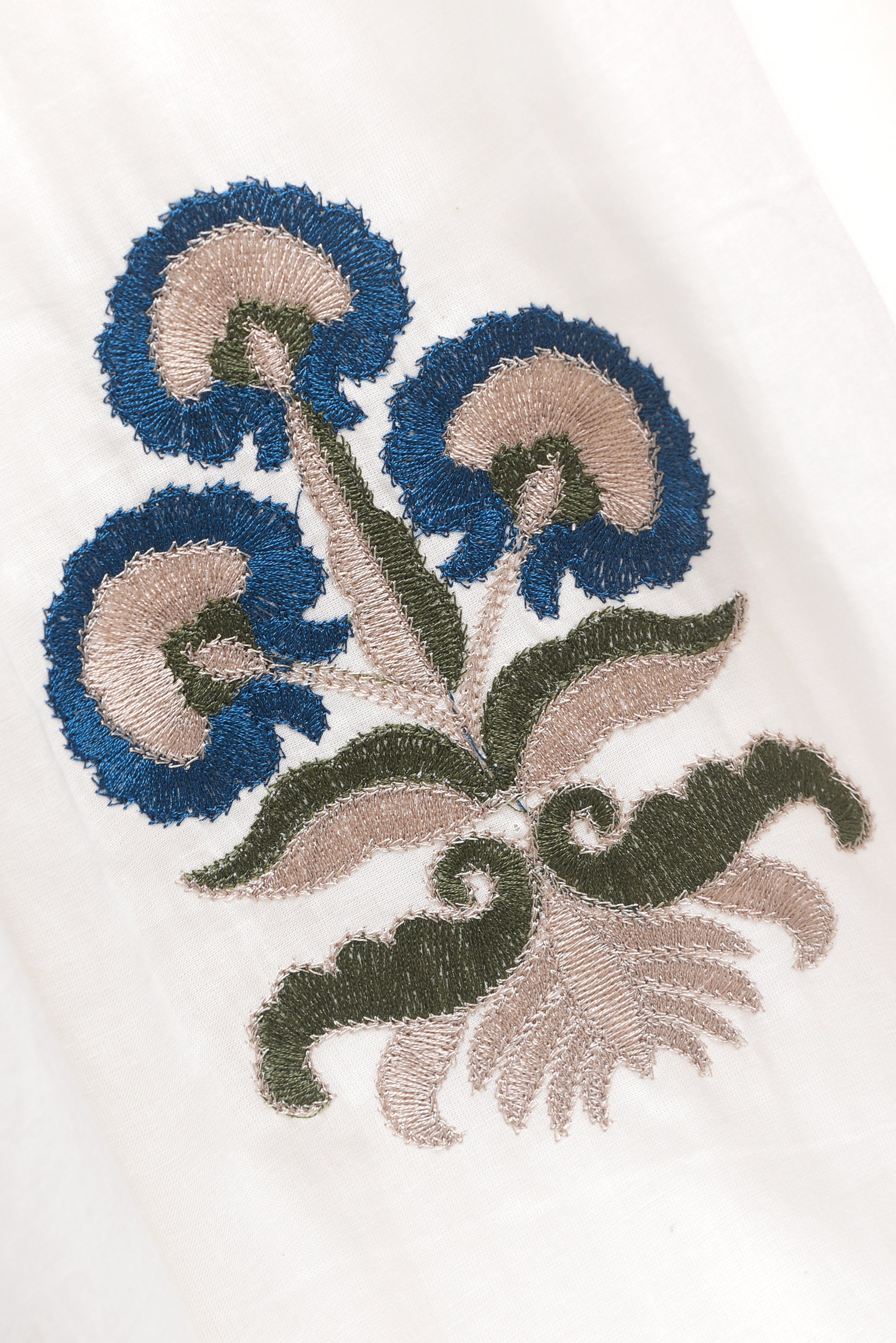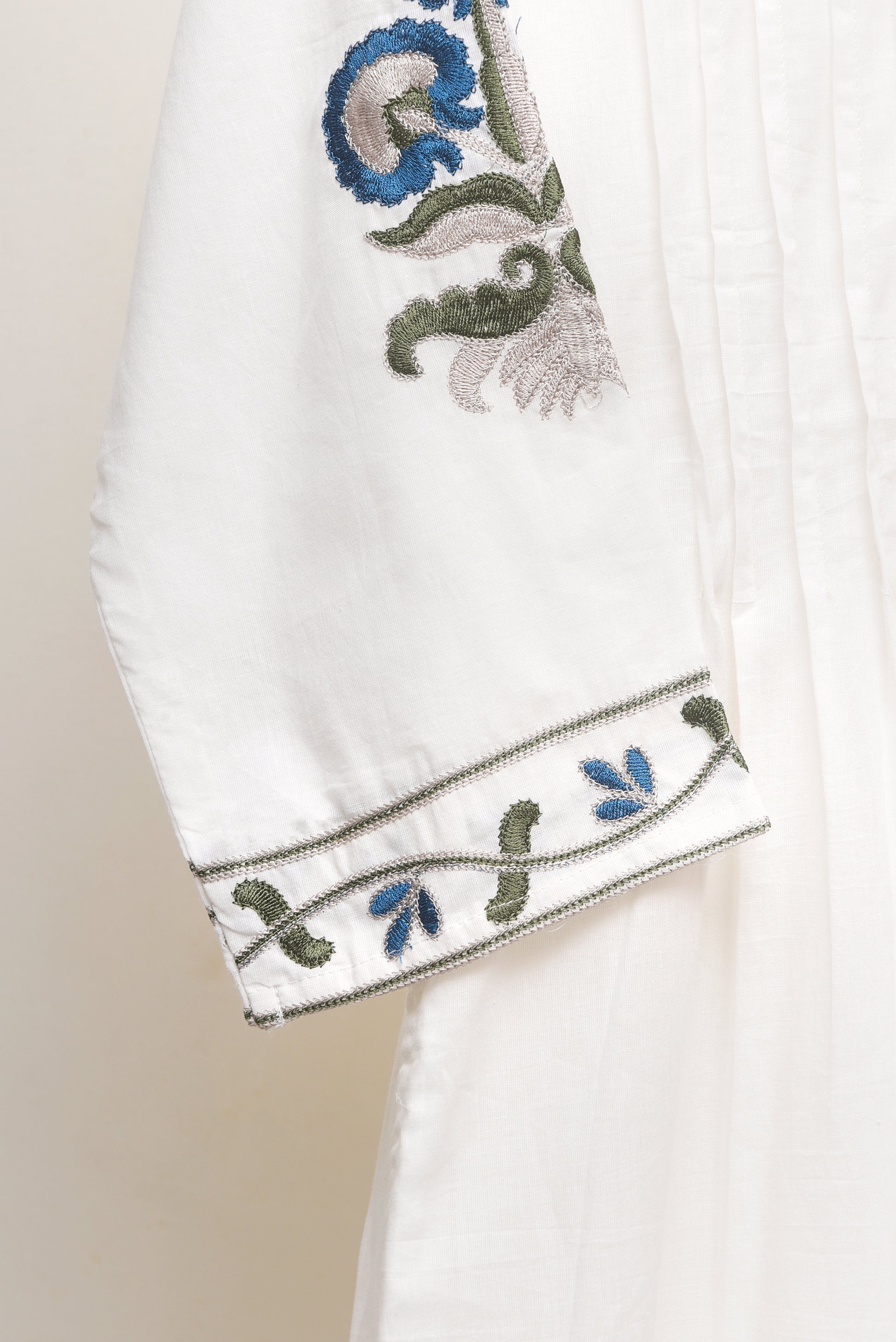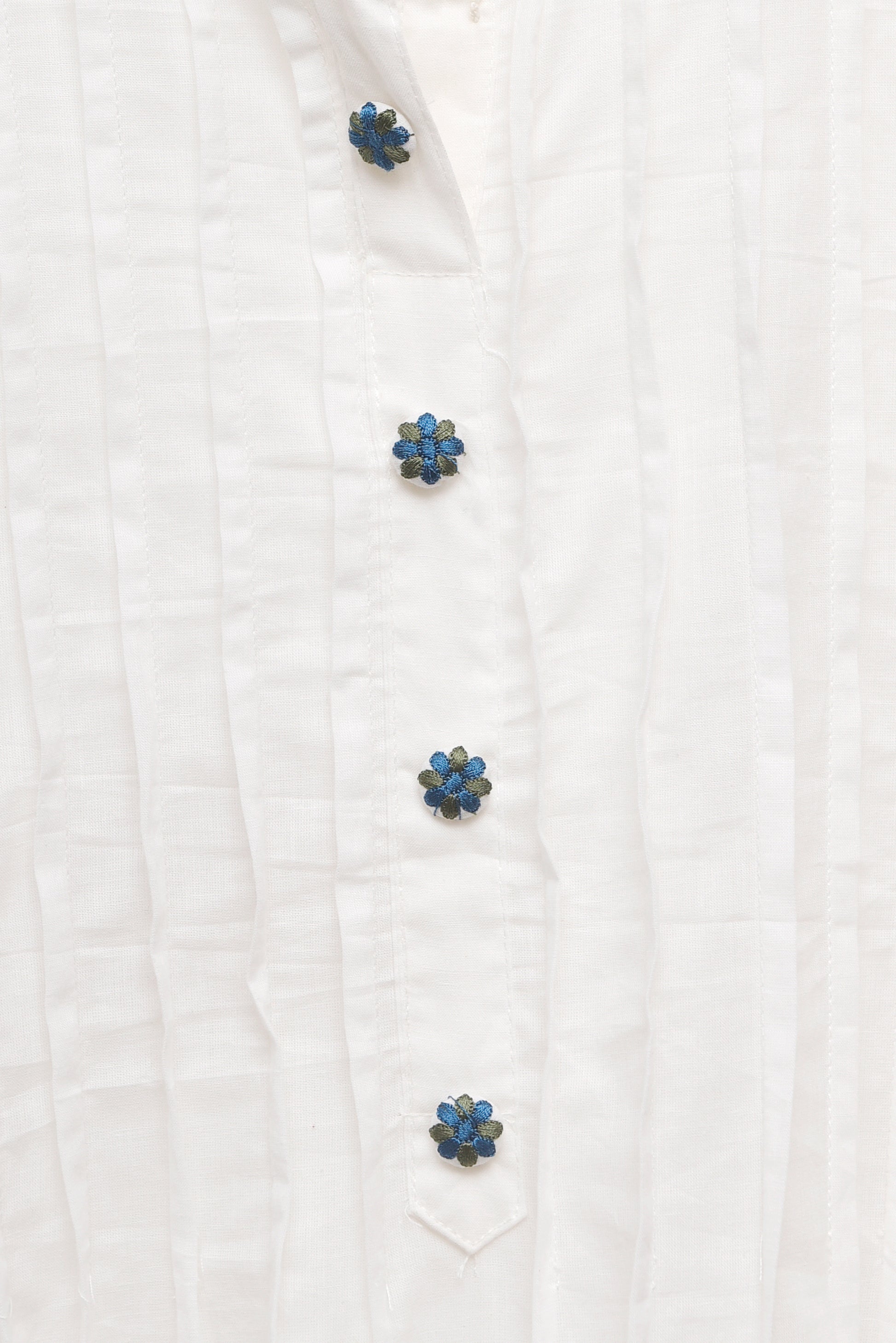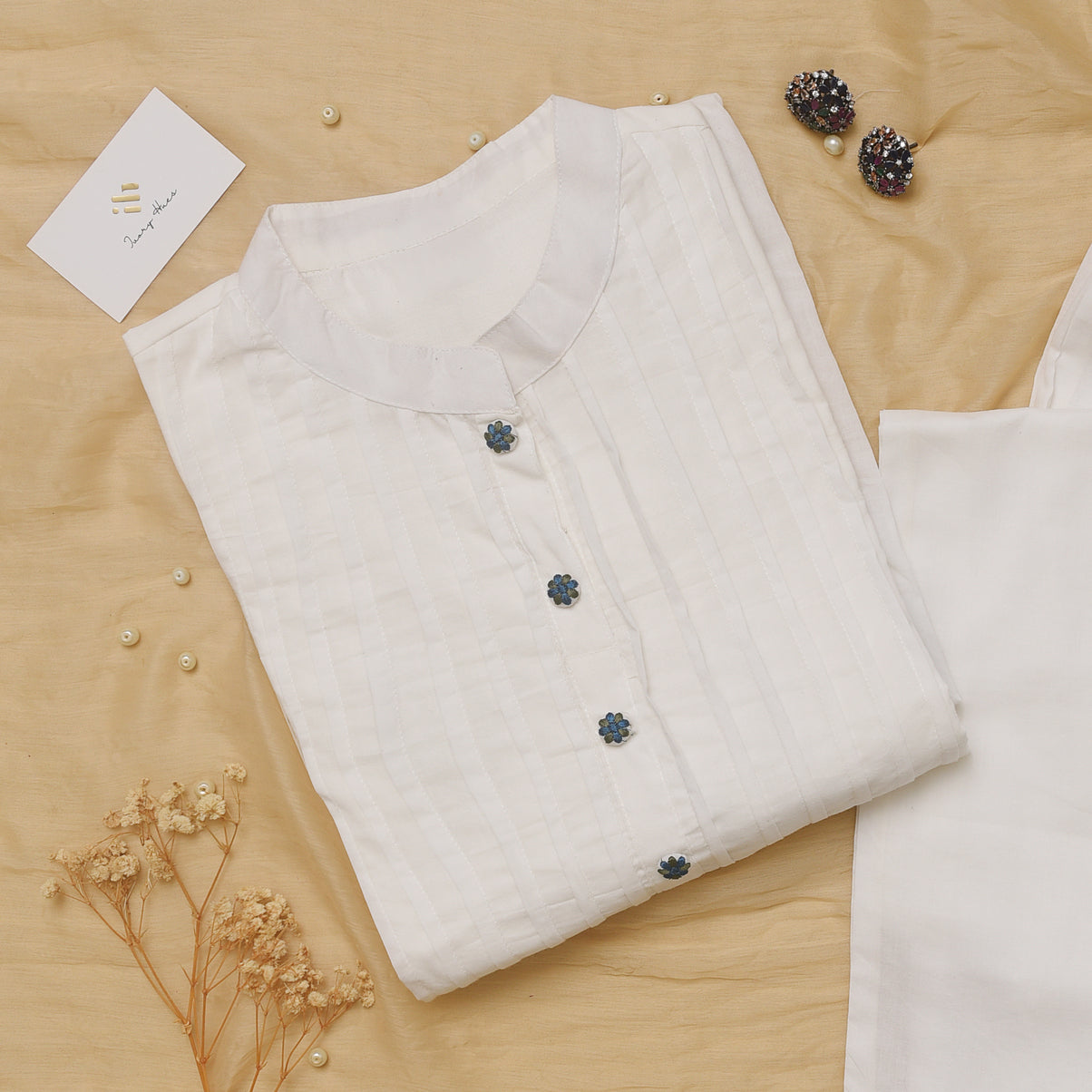 Meher Sitara is an elegant pure cotton co-ord set in a timeless white shade, designed for effortless grace. The top features delicate embroidery on the neckline and sleeves, enhanced with neat pintucks that flow into a gently flared silhouette. Embroidered buttons along the placket add a charming detail to its simplicity, while the matching bottoms complete the look with understated elegance. Perfect for a temple visit, a chai with friends, or a casual outing, Meher Sitara is comfort woven with quiet sophistication.