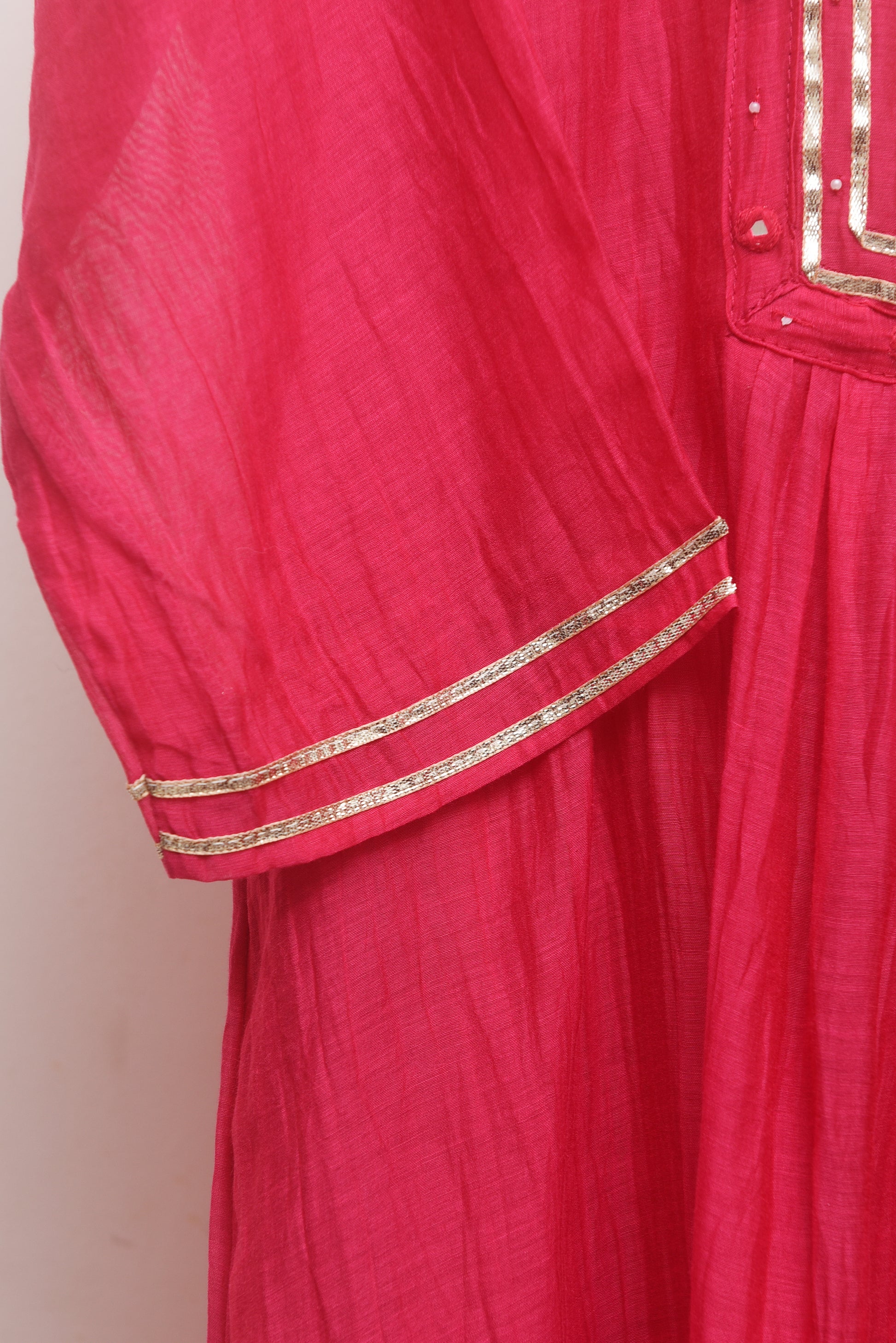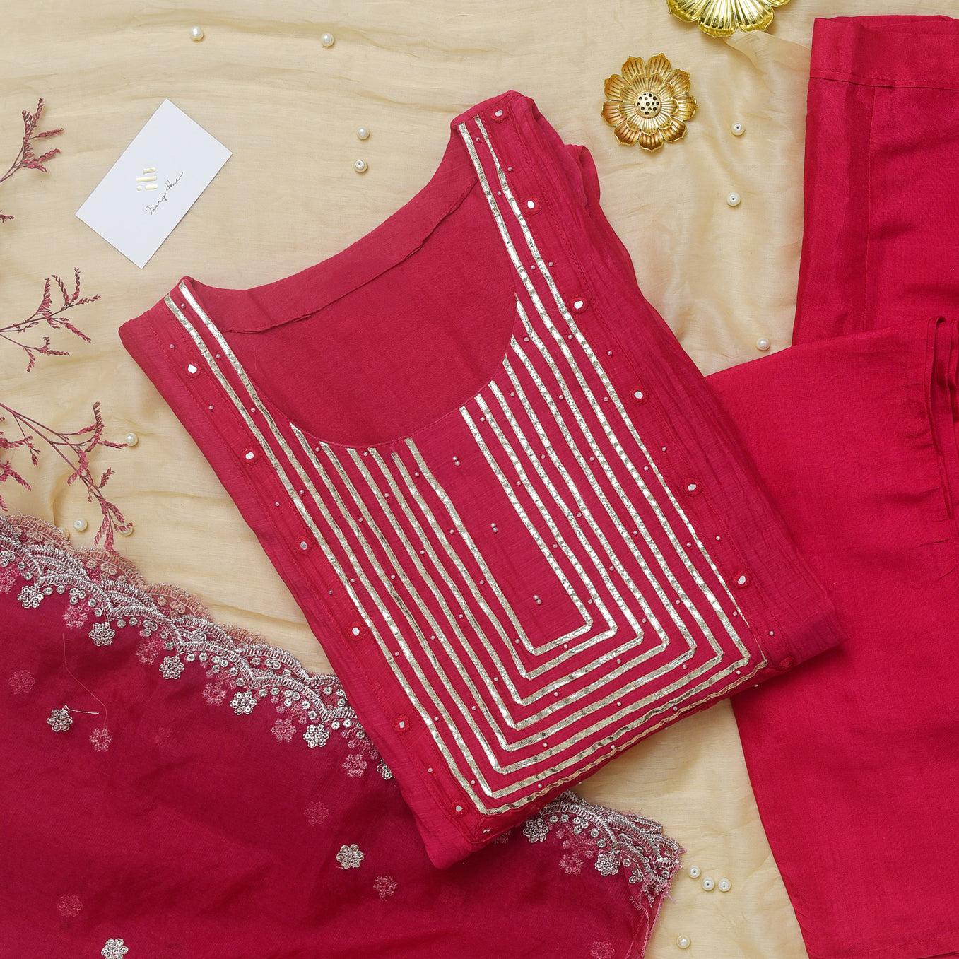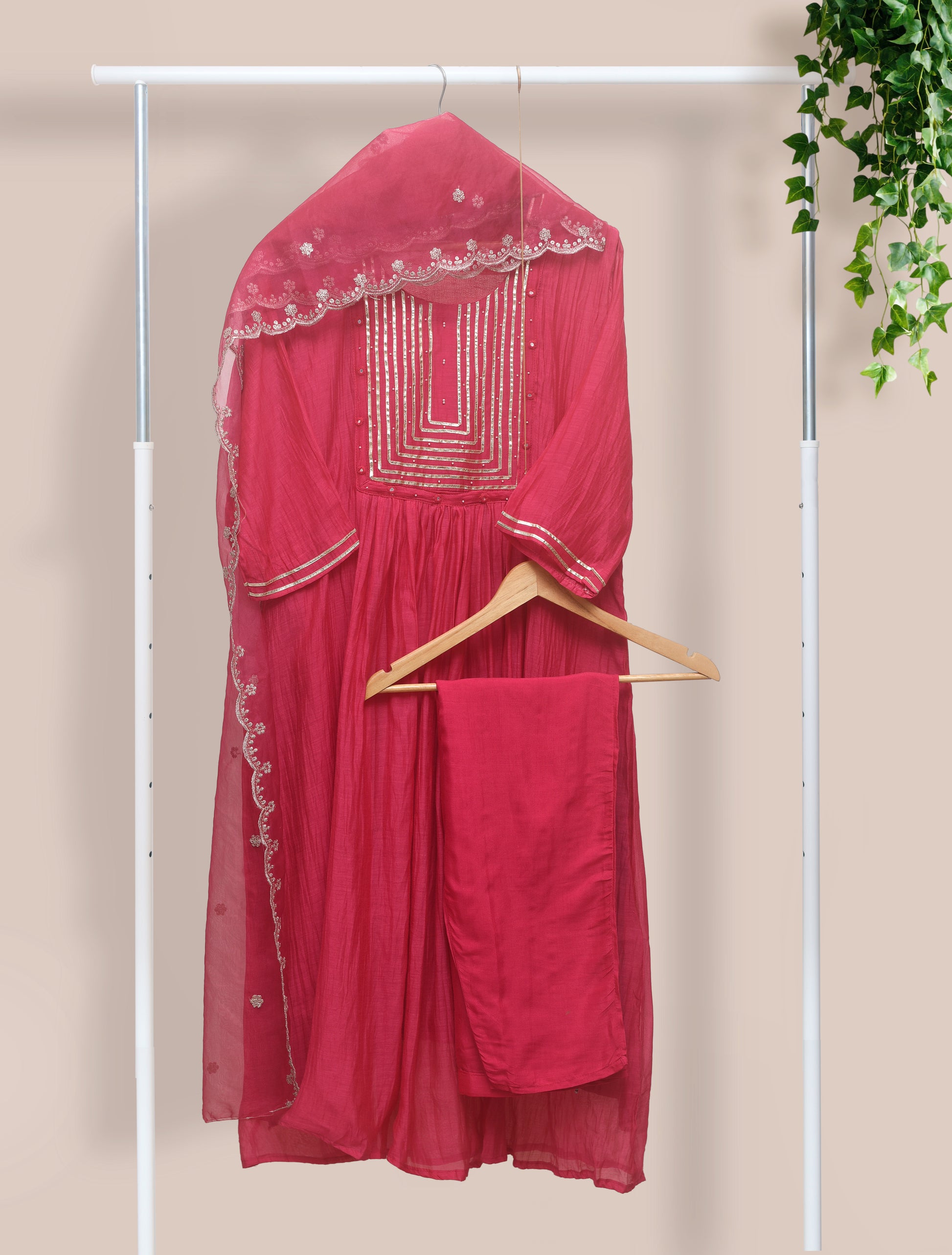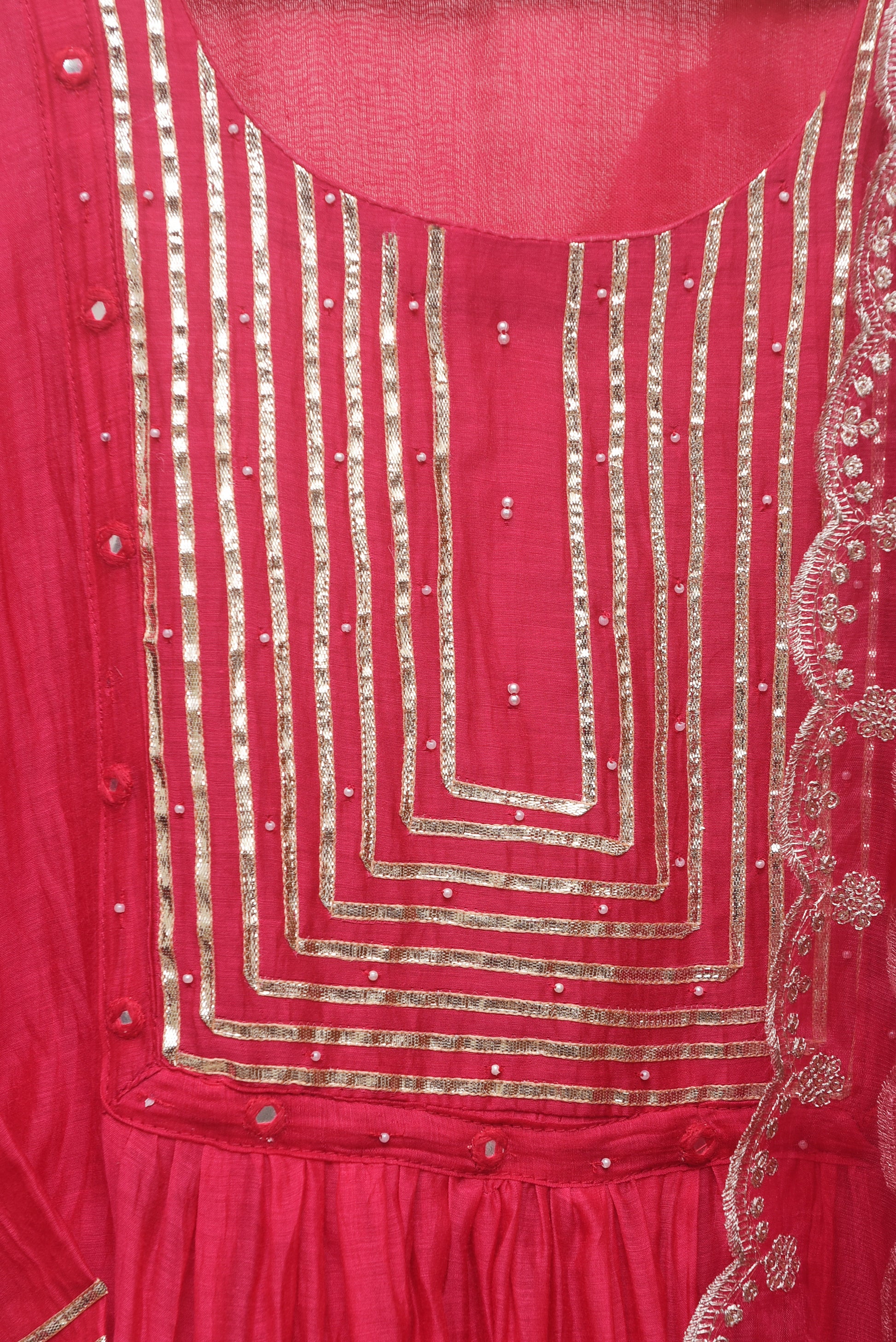 Noor Gulnaz is a striking three-piece mul chanderi suit in a rich magenta shade, crafted to make a statement at festive and special occasions. The kurta features a beautifully adorned neckline and sleeves with intricate embroidery, paired with a flattering flared silhouette that drapes gracefully. The look is elevated with a delicate organza dupatta, finely embroidered and finished with scalloped edges for an added touch of luxury. Elegant, vibrant, and timeless, Noor Gulnaz is a piece that flatters all and radiates festive charm.