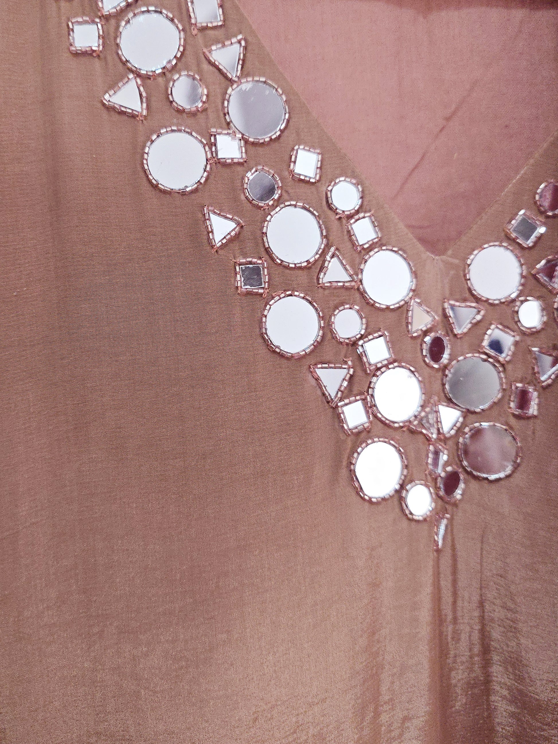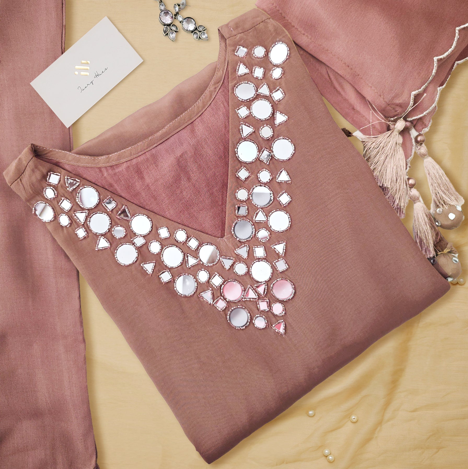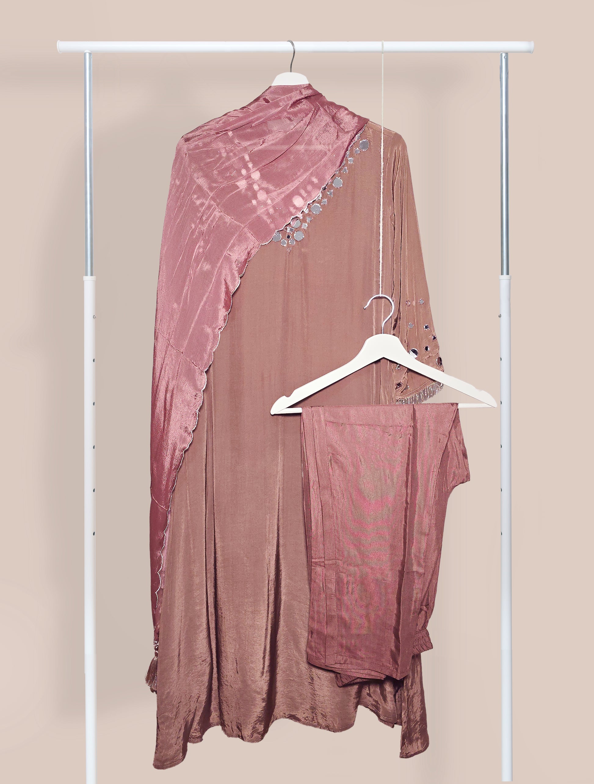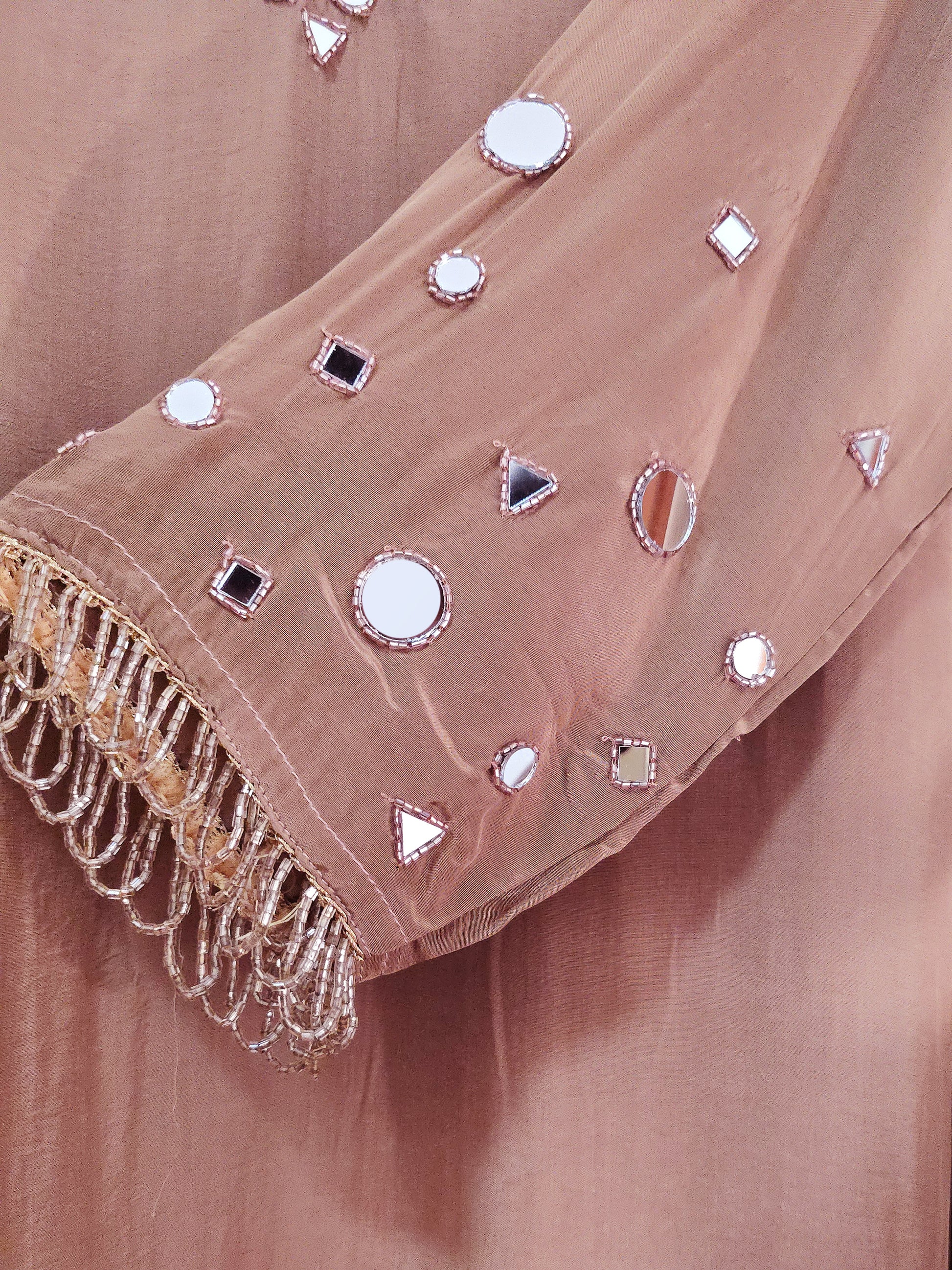 Noor Haseen is crafted in a soft dusty mauve crepe that drapes beautifully, creating a silhouette that feels both fluid and refined. The neckline and sleeves are intricately embellished with mirror work and delicate beaded tassels that add a festive sparkle. Paired with matching pants and a scalloped embroidered dupatta, this ensemble is effortlessly elegant — perfect for evening soirées, festive gatherings, or special celebrations.A statement in subtle glamour, Noor Haseen celebrates the art of understated luxury.