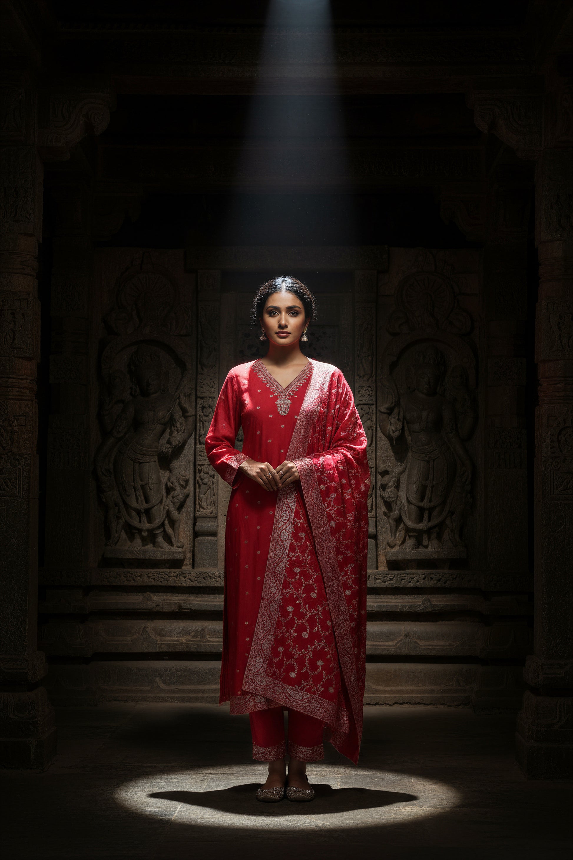 Noor Husn is a celebration of beauty and radiance. Drenched in a striking tomato red hue, this three-piece festive ensemble is adorned with exquisite hand embroidery along the neckline and delicate golden buttas scattered across the fabric, exuding timeless charm. The piece de resistance is the opulent brocade shawl, adding a regal touch and capturing the essence of grandeur. Designed for celebrations, Noor Husn is a true showstopper, effortlessly elegant, radiant, and unforgettable.