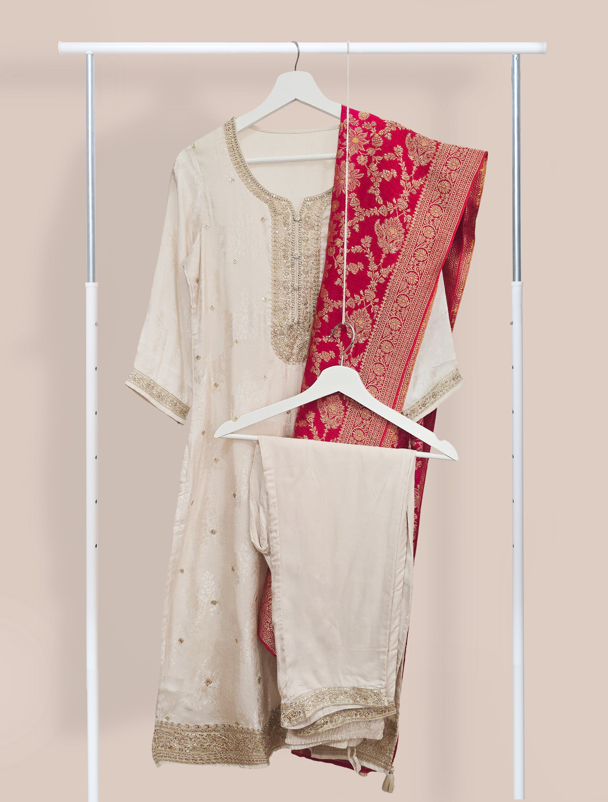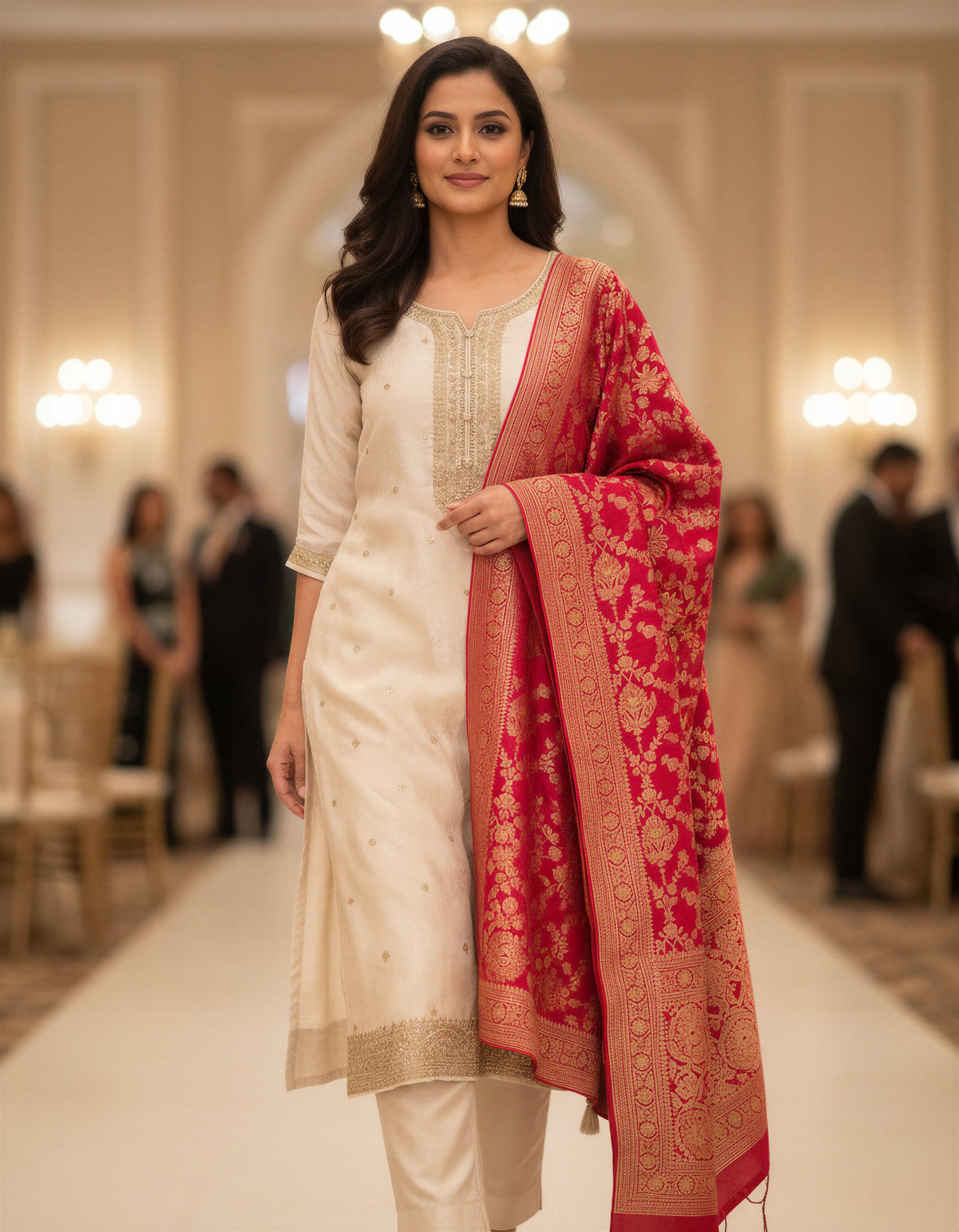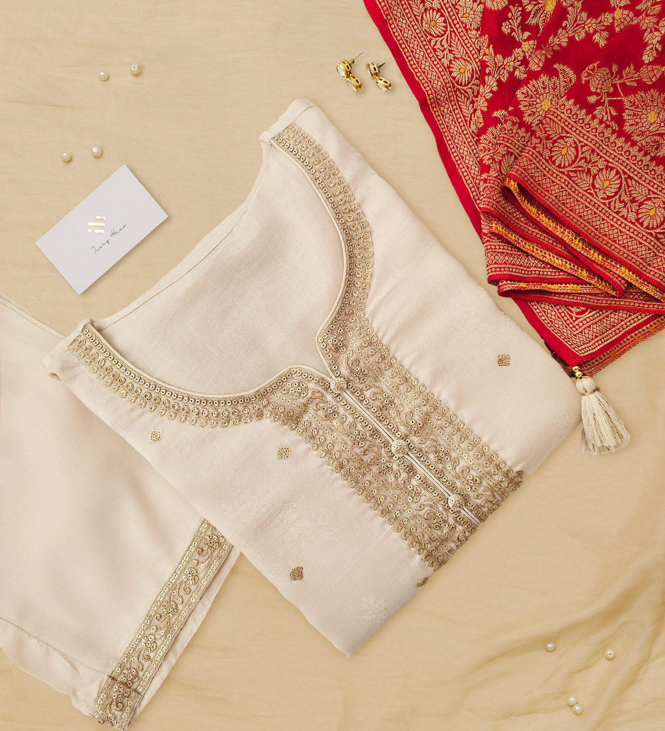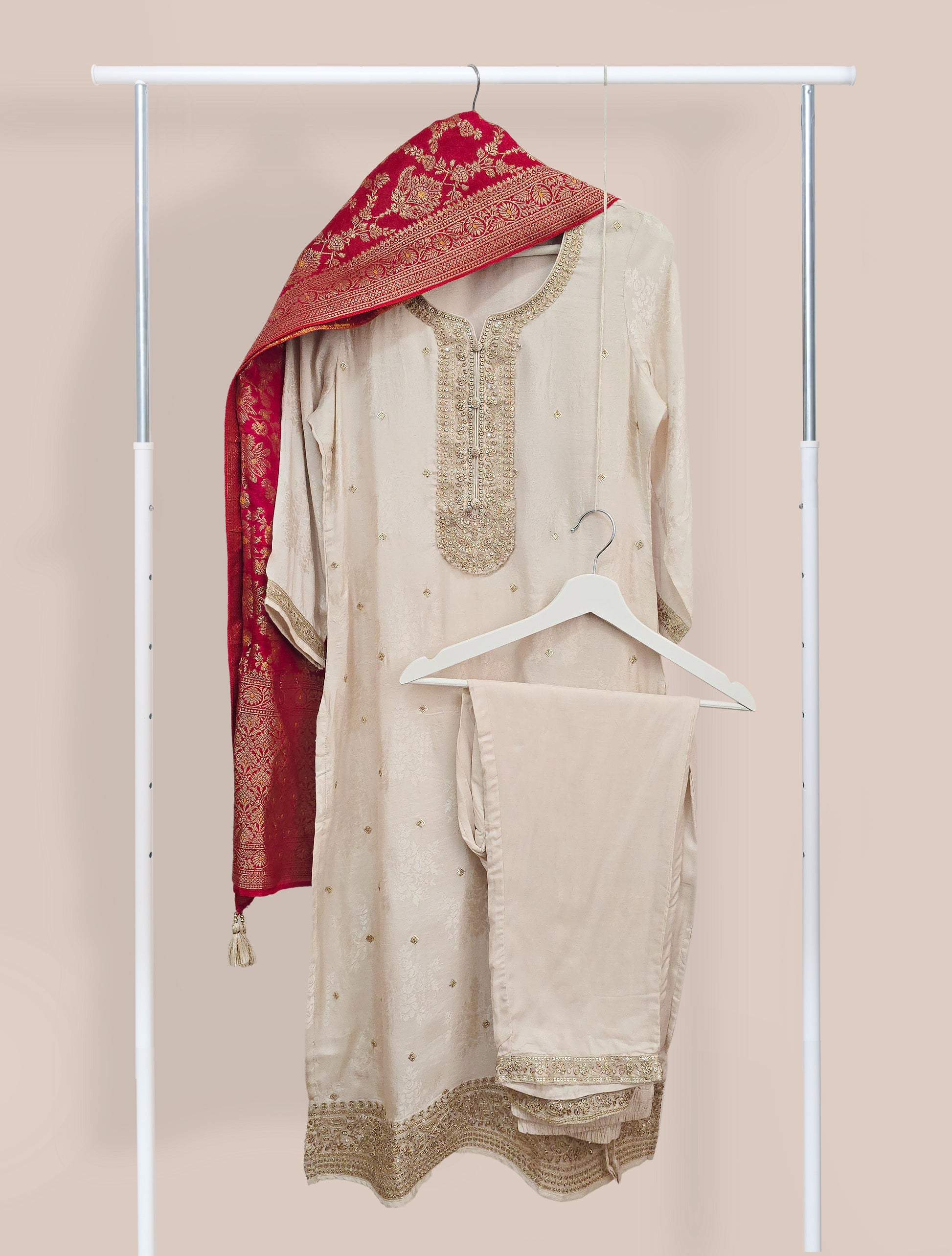 An exquisite three-piece suit in off-white jacquard silk, Noor Naira radiates sophistication and quiet luxury. The kurta features delicate embellishments along the neckline and sleeve hem, adding a touch of festive sparkle without overpowering the look.The ensemble is paired with a plain off-white bottom to balance the richness of the fabric, while the statement brocade dupatta — a stunning dual-shaded blend of red and magenta — steals the show with its lustrous weave and regal allure.Graceful, poised, and undeniably charming, Noor Naira is a true head-turner — perfect for celebrations that call for understated opulence.