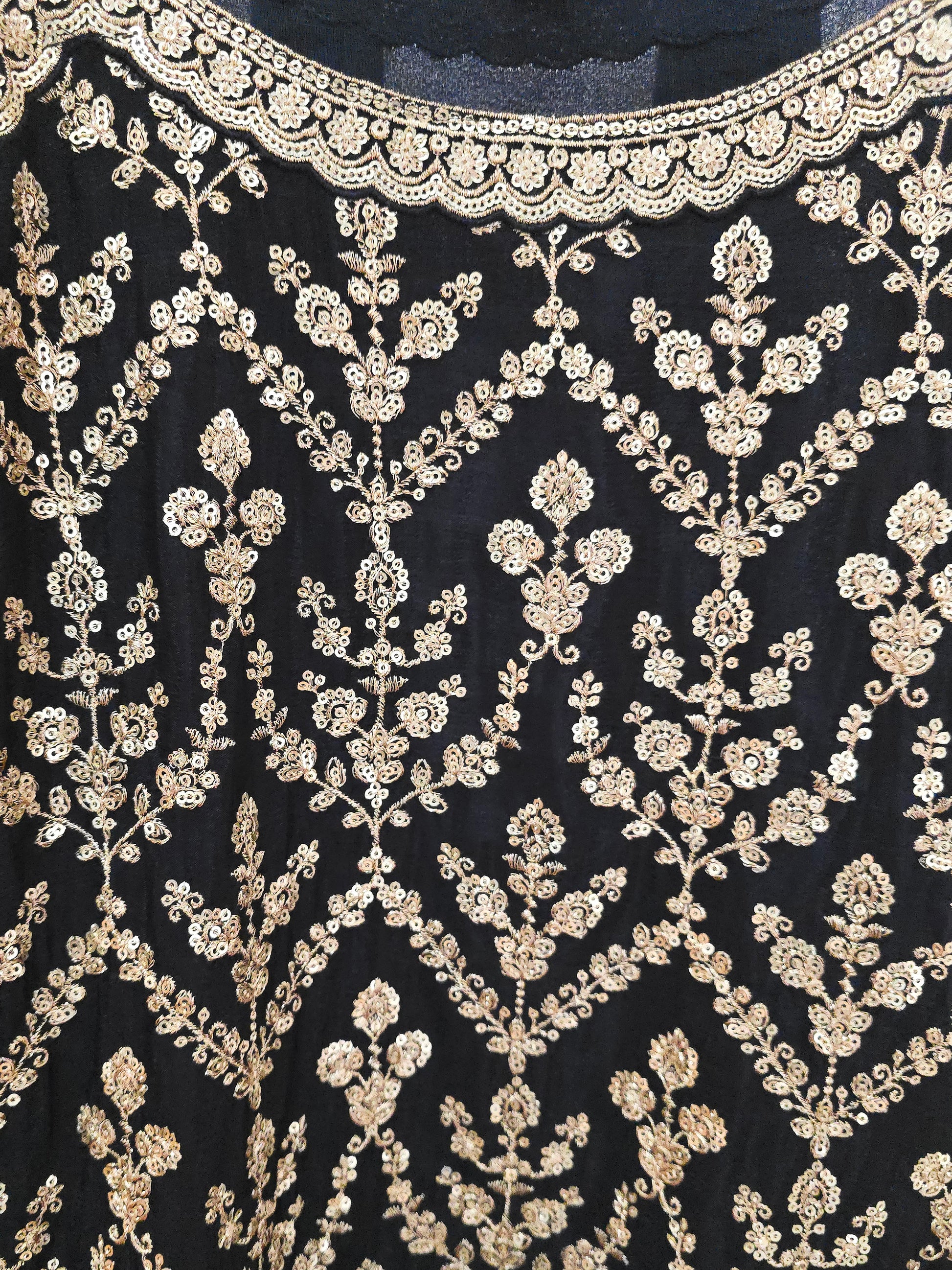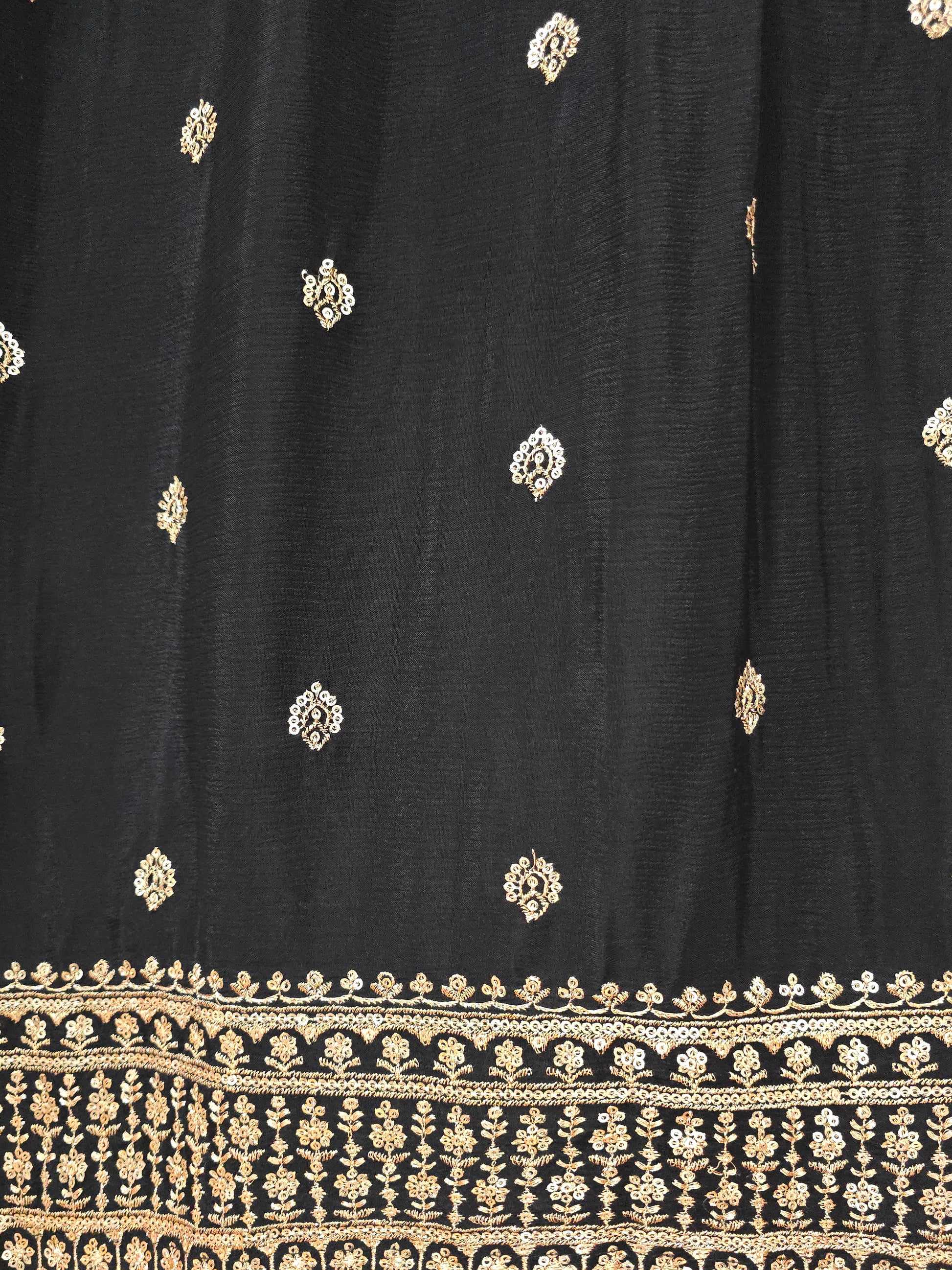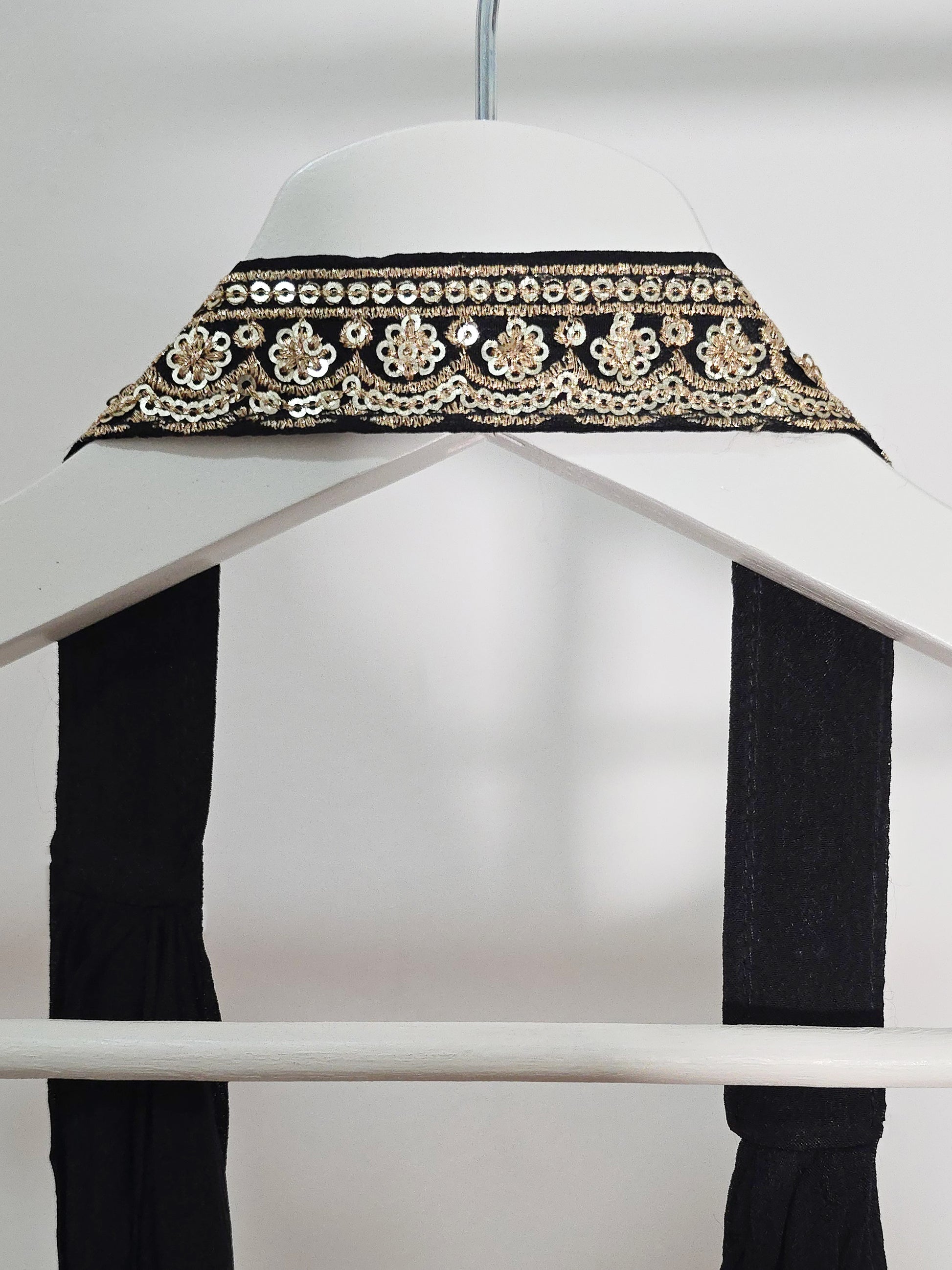 This exquisite three-piece partywear set in rich black exudes sophistication and allure. The sleeveless top is beautifully adorned with intricate embroidery and delicate embellishments, finished with a refined border at the hemline for that touch of drama.The flared sharara-style pants feature golden buttas scattered gracefully across the fabric, complemented by a matching embellished border that ties the look together. The statement dupatta adds to the elegance, featuring a sleek design and embroidery along the portion that drapes gracefully over the neck.Completing the ensemble is a beautifully crafted embellished potli bag — a charming addition that elevates the entire look. Perfect for festive occasions or evening soirées, Noor Noir is elegance redefined.