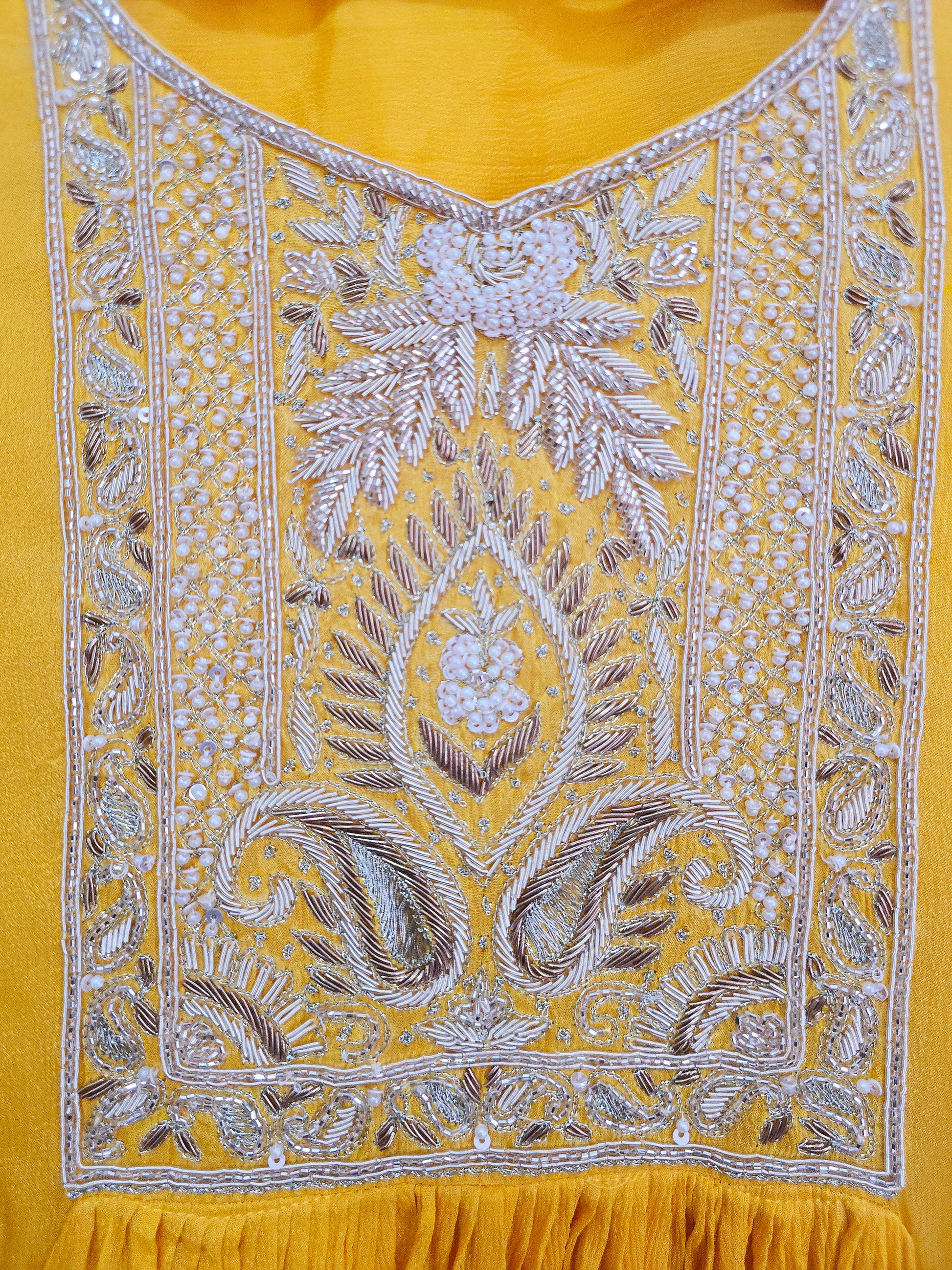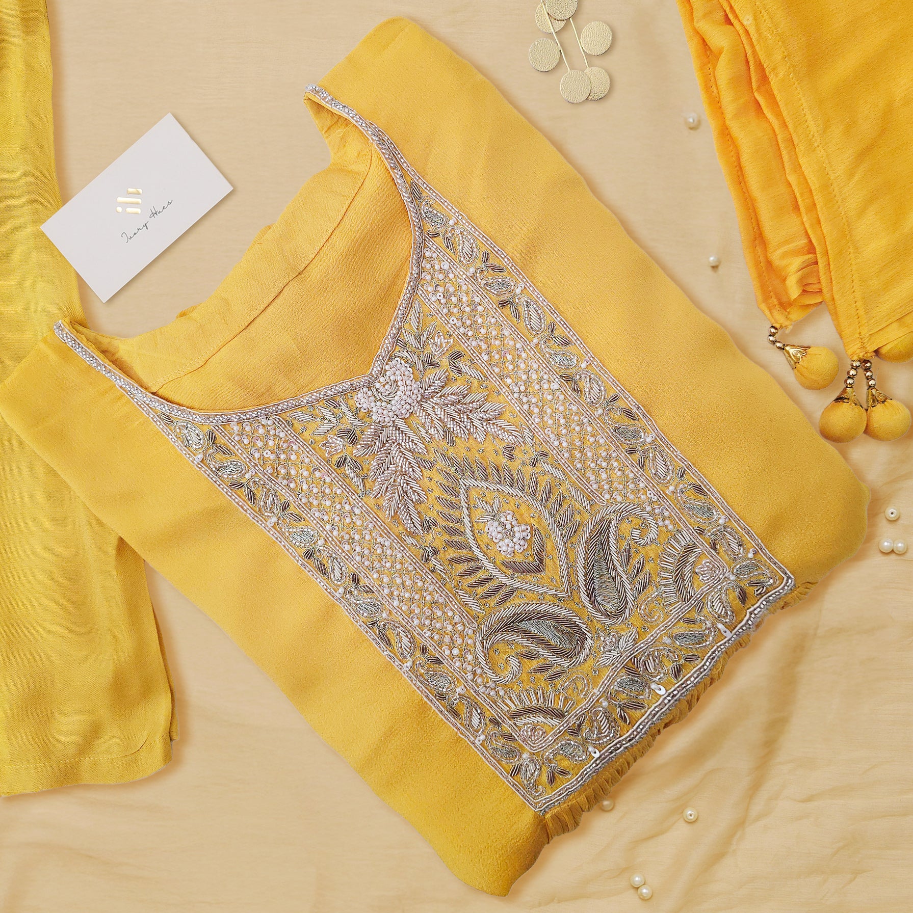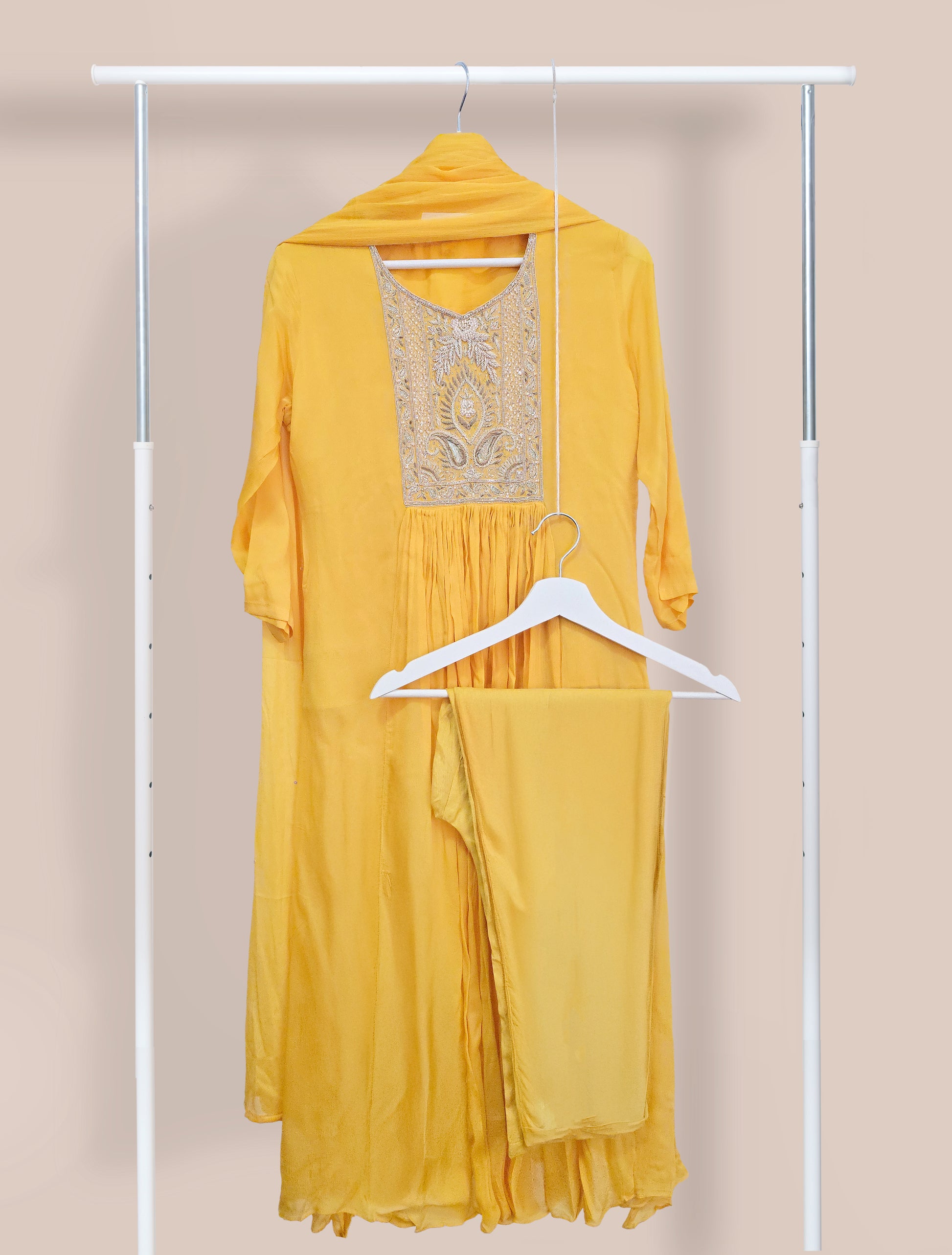 A radiant three-piece set in sunflower yellow crafted in luxurious mul chanderi, Noor Reya is a perfect blend of elegance and festivity. The kurta features delicate hand embroidery along the neckline and placket, with subtle gathers that flow gracefully below, adding movement and charm.The plain pants balance the intricate detailing, keeping the look refined and sophisticated. The dupatta, adorned with scattered sequins, catches light beautifully — creating a soft shimmer that enhances the festive appeal.Effortlessly elegant, Noor Reya is made for those who love understated luxury that shines in every celebration.