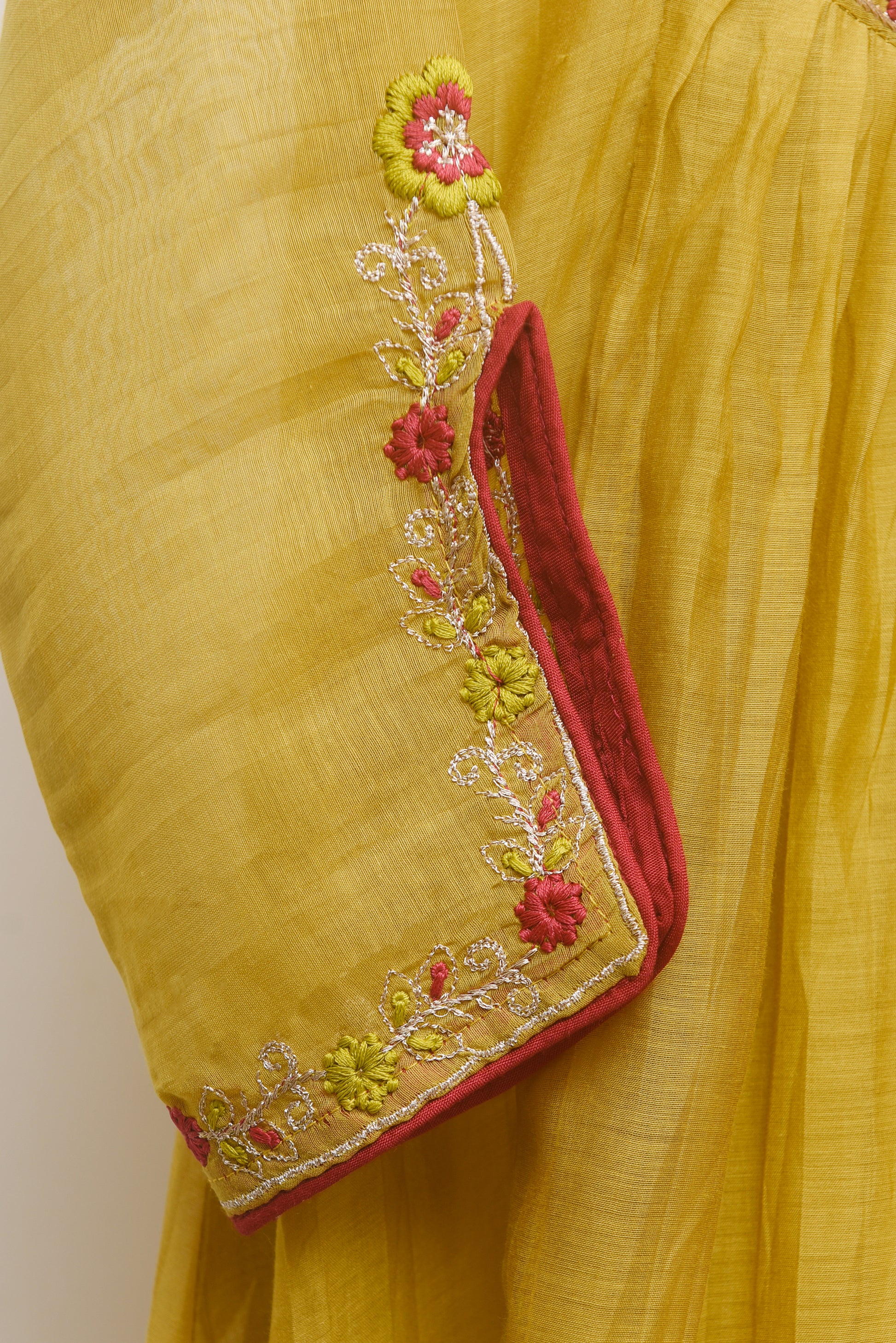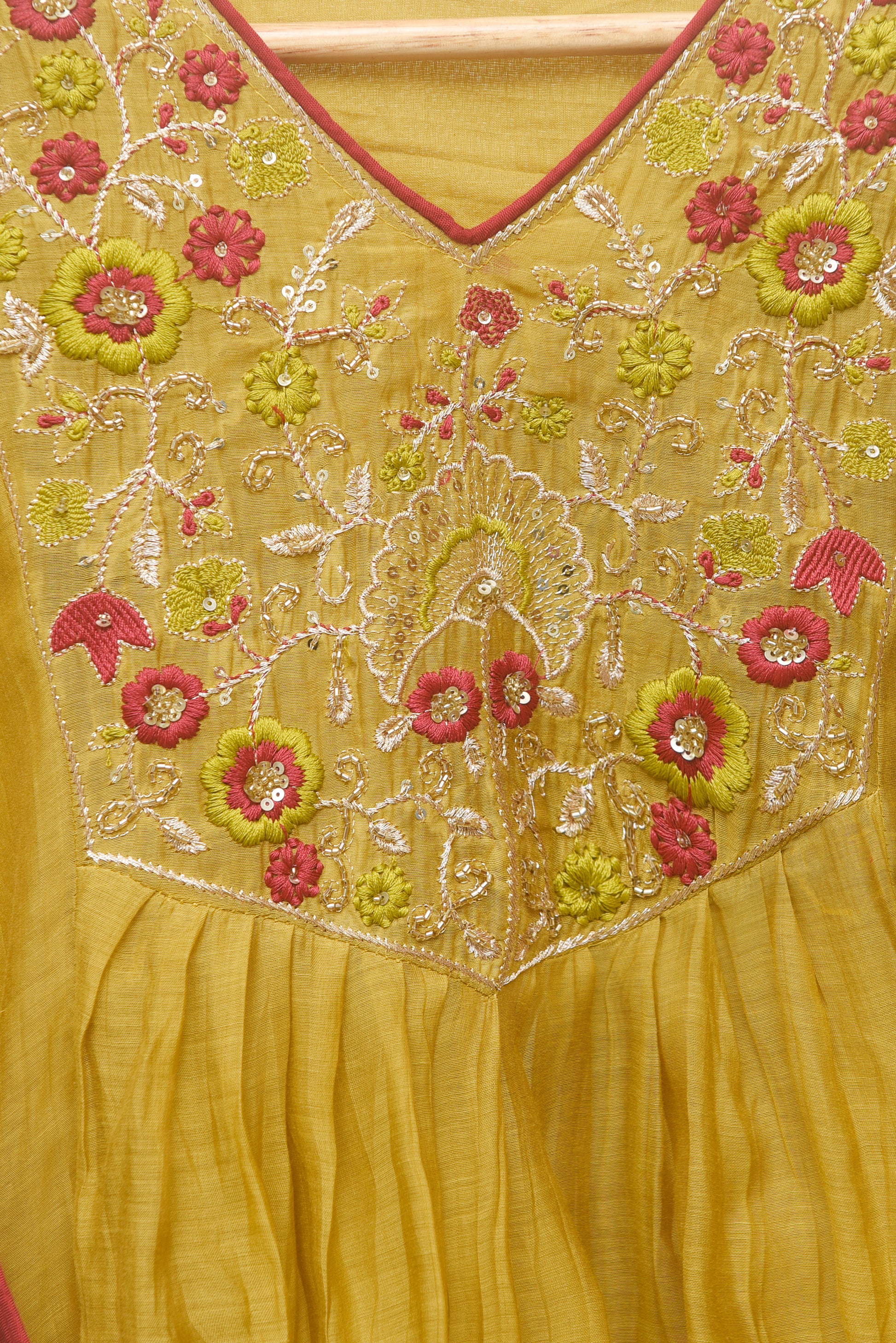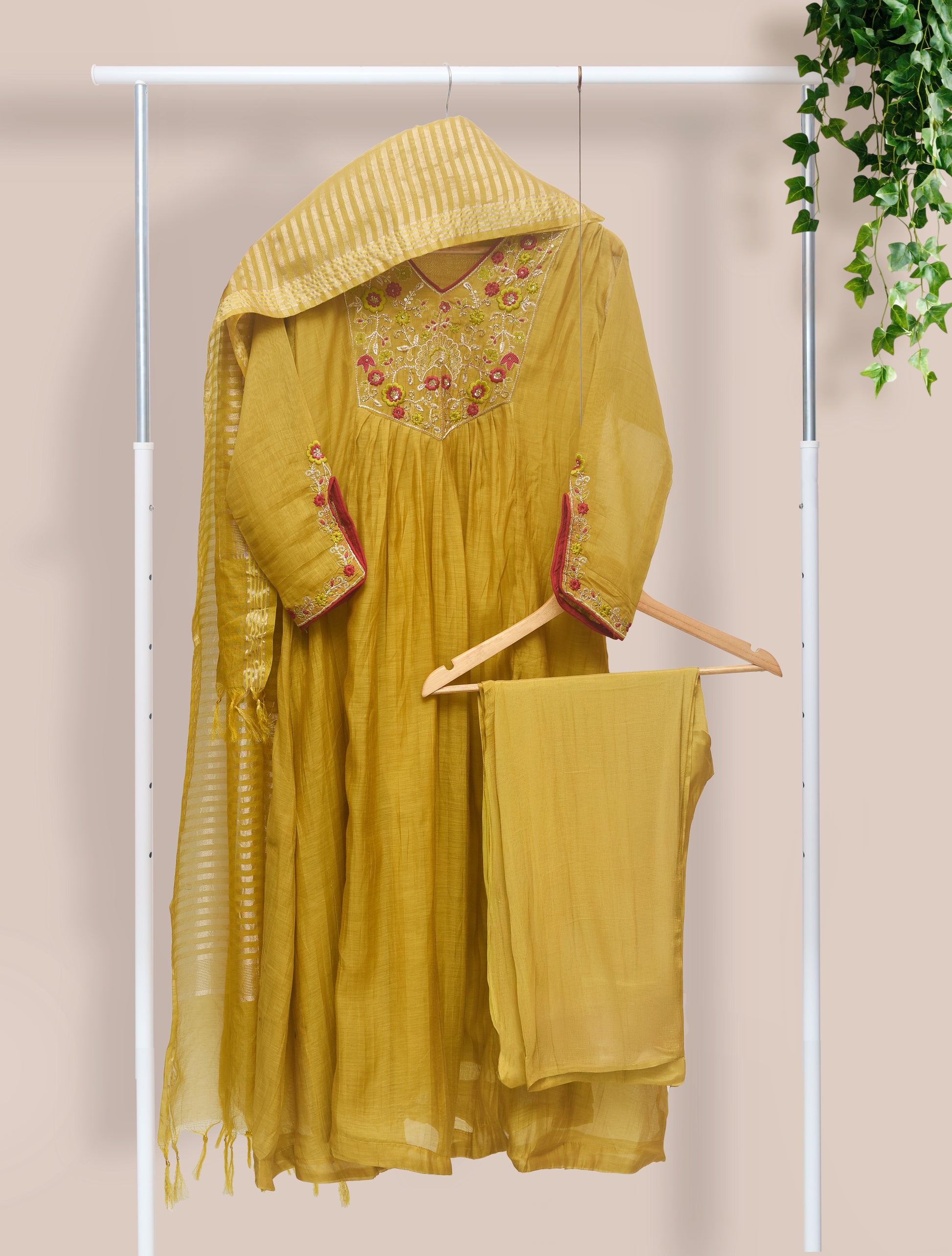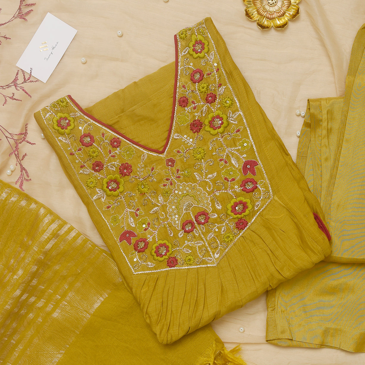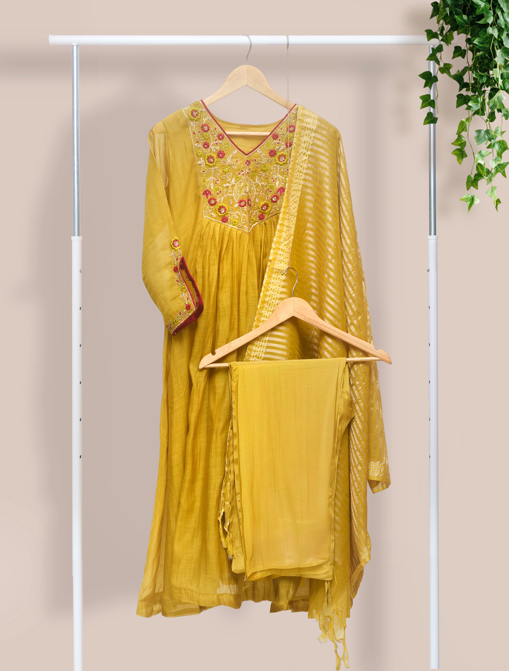 Noor Zahra is an exquisite three-piece mul chanderi suit in a luminous mustard hue, radiating festive elegance. The kurta features delicate embroidery along the neckline and sleeves, with a flattering flared silhouette that drapes beautifully. Designed to embody richness without overwhelming, it is paired with a complementing dupatta woven with subtle zari lines, adding just the right touch of festive sparkle. A timeless ensemble for celebrations, Noor Zahra is where sophistication meets tradition.