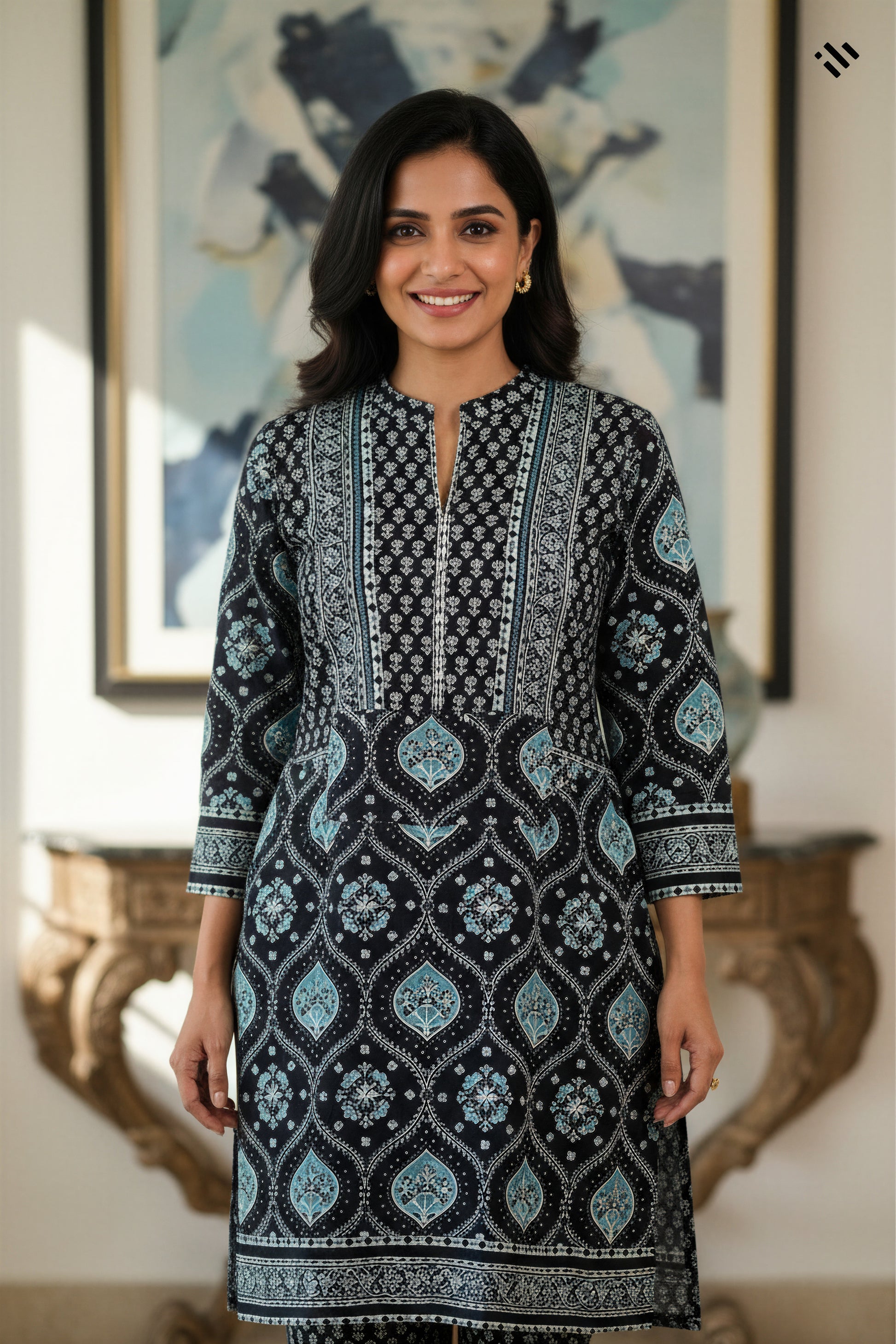 "Sunehri Jashn" is a stunning Sanganeri printed co-ord set in a striking combination of black and blue. Adorned with stylish front pockets and delicate embellishments, this ensemble features a lovely border on the sleeves that adds an extra touch of elegance. Perfect for any celebration, it beautifully blends timeless craftsmanship with contemporary style.