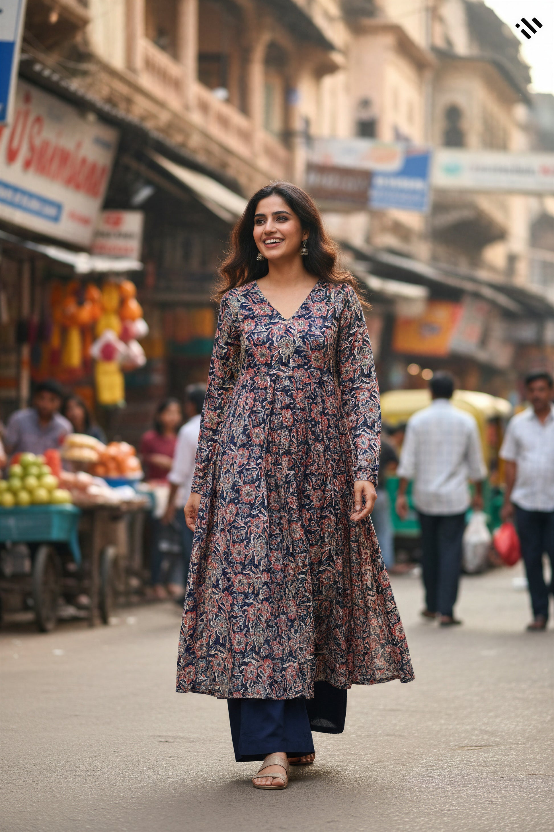 Sunehri Shabnam is a graceful Anarkali co-ord set, brought to life with enchanting Kalamkari prints. The fluid silhouette is adorned with delicate embellishments, ruched sleeves, and elegant tassels, adding a touch of charm. Effortlessly stylish yet rooted in tradition, this ensemble is perfect for those who appreciate timeless beauty with a contemporary edge.